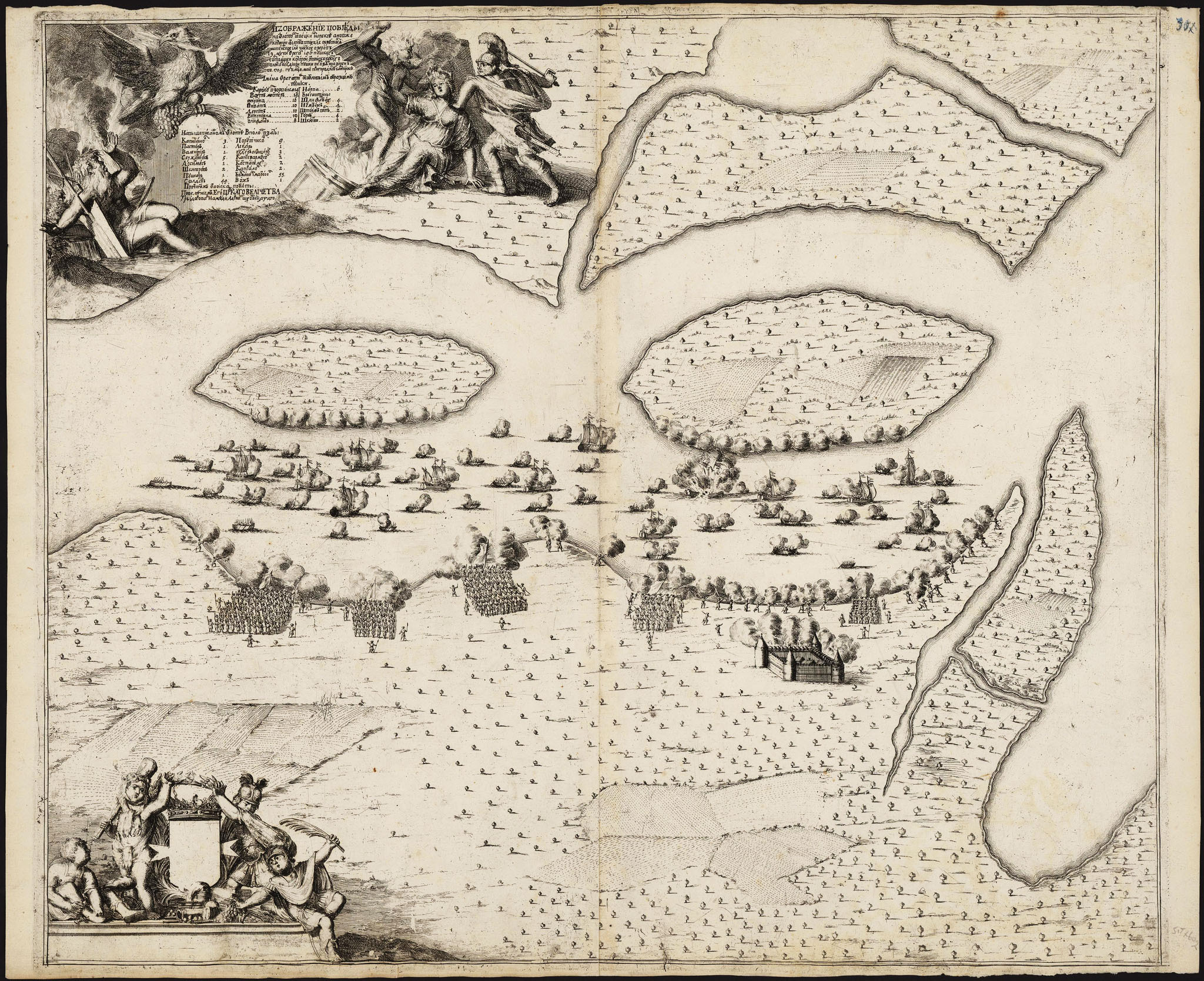 Шхонебек (Схонебек) Адриан. Панорама сражения на реке Амовже (Эмбахе) при впадении ее в Чудское озеро 4 мая 1704 года