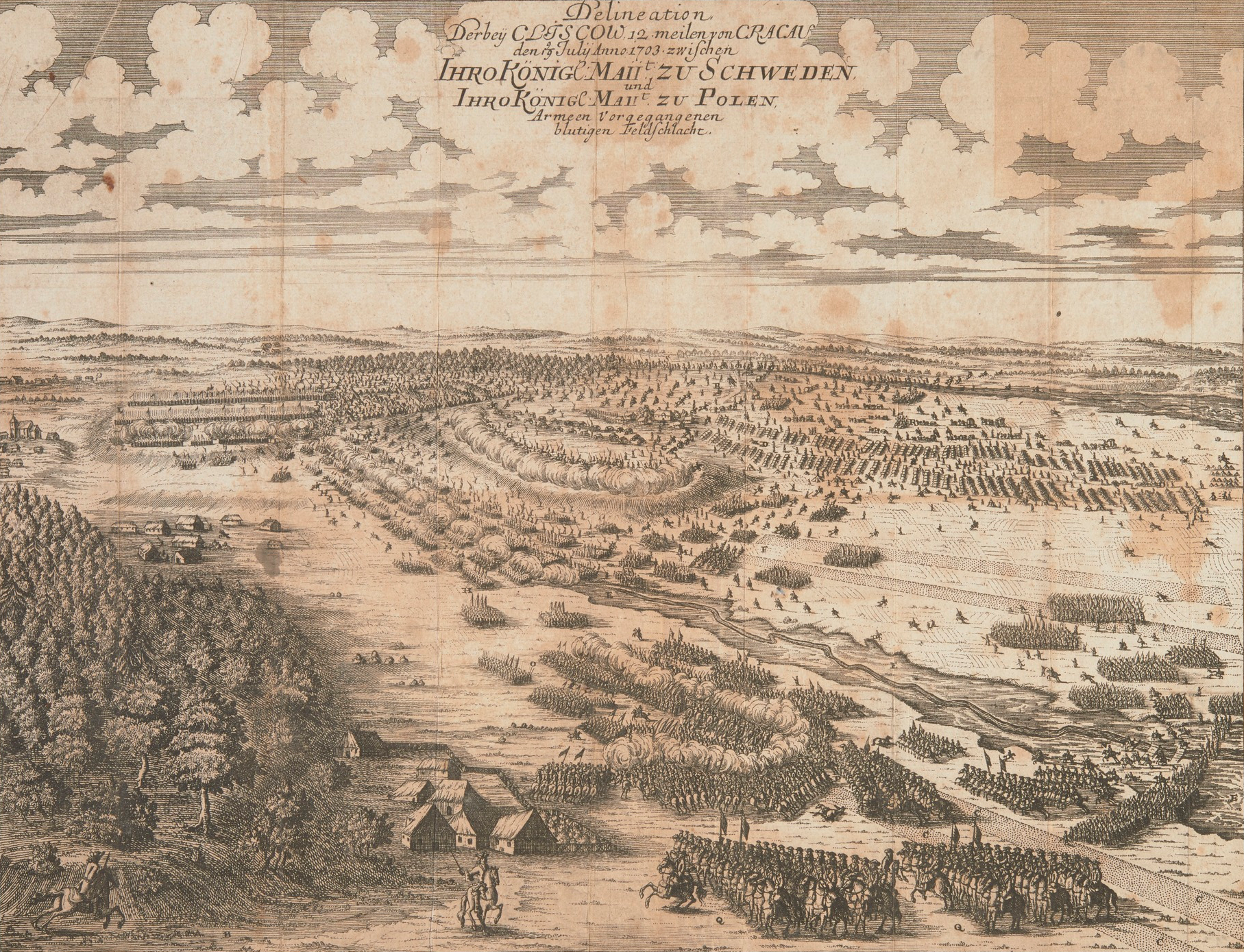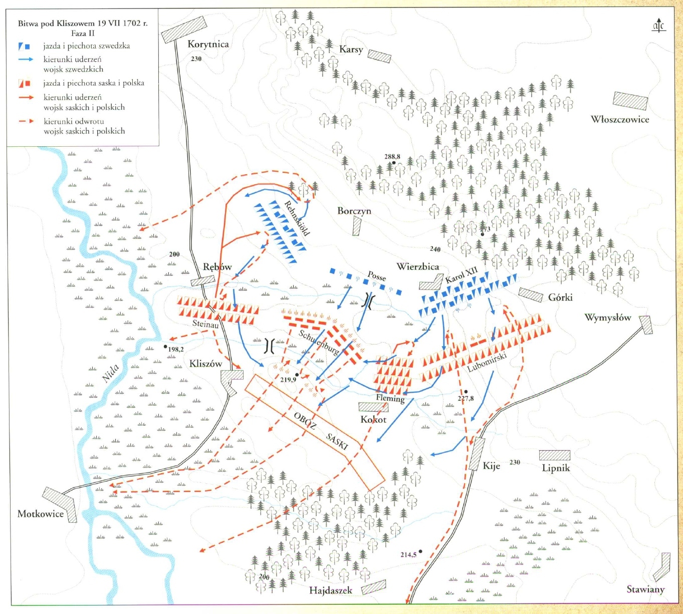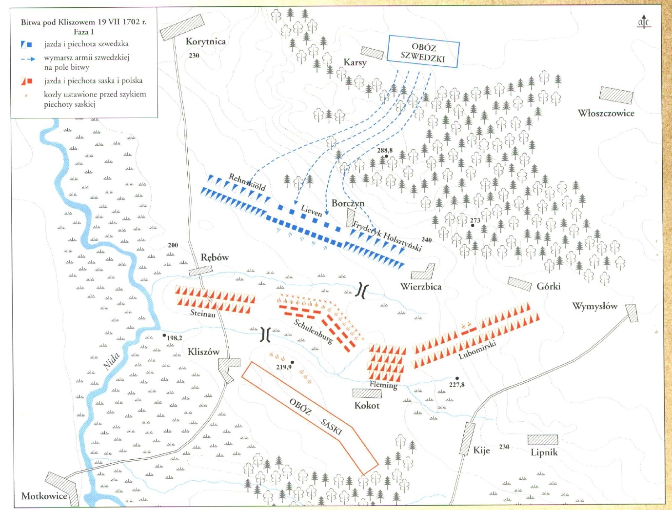 Две шведские армии соединились 7 июля южнее города Кельце и немедленно атаковали противника, находившегося в лагере на возвышенности возле Клишова. Для саксонцев и иже с ними атака оказалась неожиданной – они считали, что, поскольку лагерь защищен болотистой местностью, они в безопасности. Что интересно – позиция действительно была выгодная, особенно с учетом преимущества в артиллерии (46 саксонских орудий против всего 4 шведских), однако Карл этот факт просто проигнорировал, заявив, что «скоро мы получим артиллерию противника, и тогда у нас ее будет больше, чем нужно».