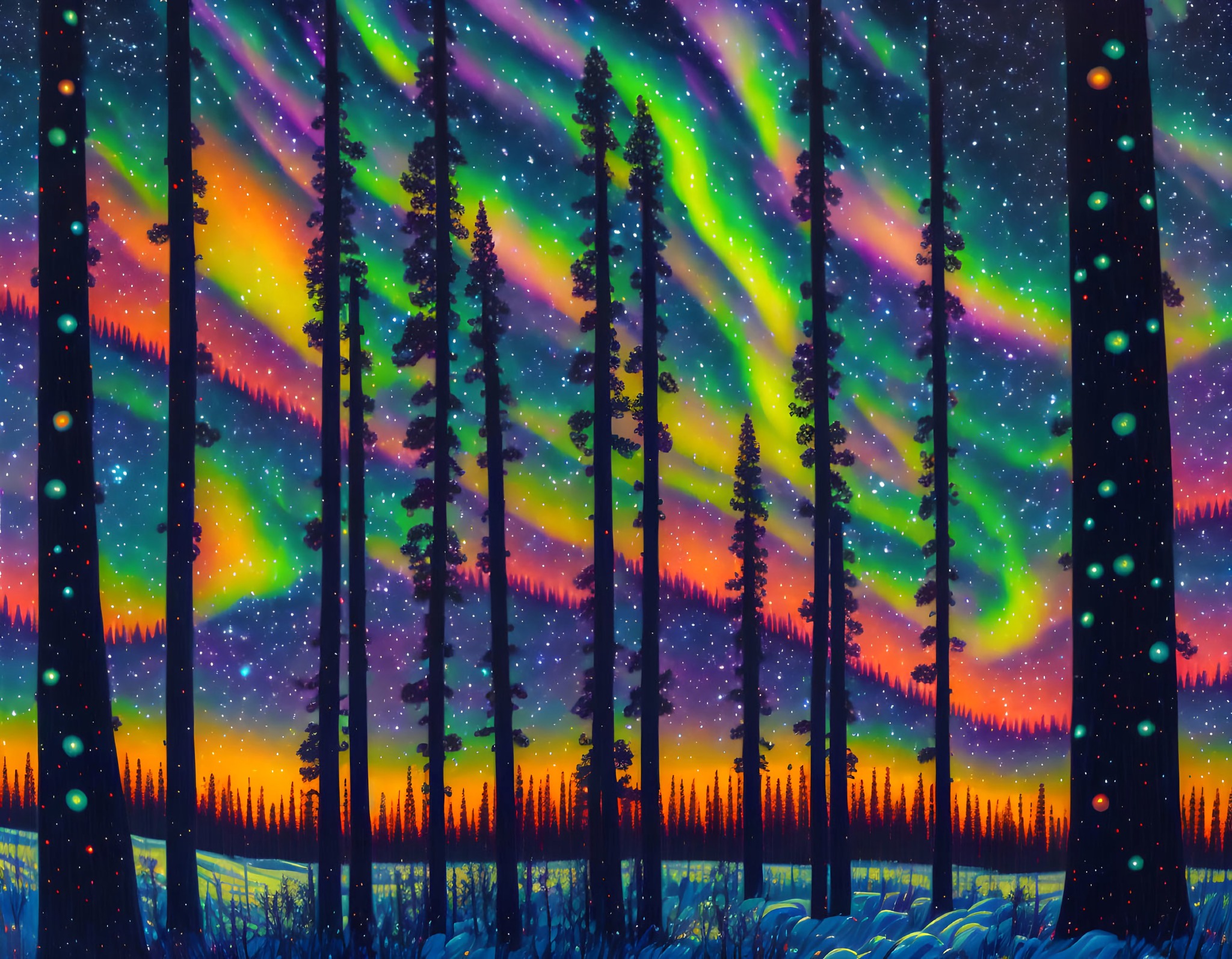 Prompt:  Spectacular Northern lights over pine forest in Finland, starry sky, meteor, view from the ground
