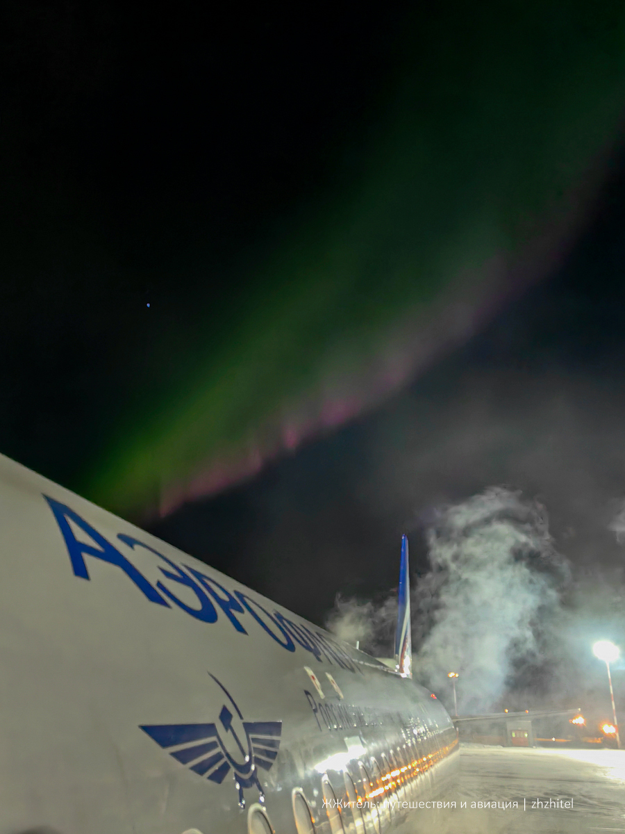 Северное сияние вспыхнуло, когда мы поднимались по трапу перед возвращением из Мурманска в Москву.