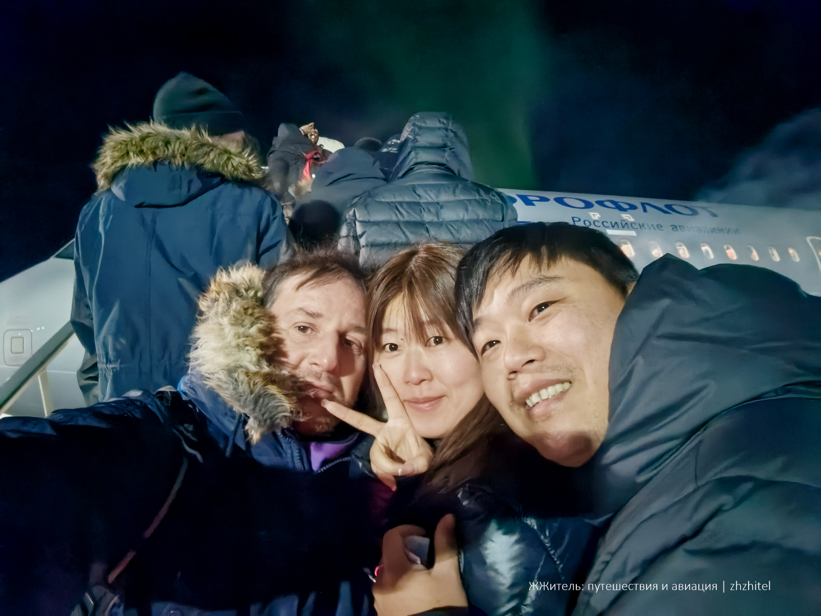 На волне всеобщего восторга запилил на трапе селфи с незнакомыми китайскими туристами, сейчас они массово едут на север России, специально, чтобы увидеть сияние.