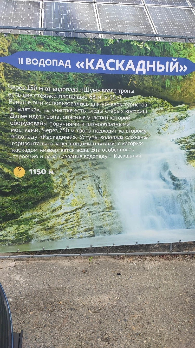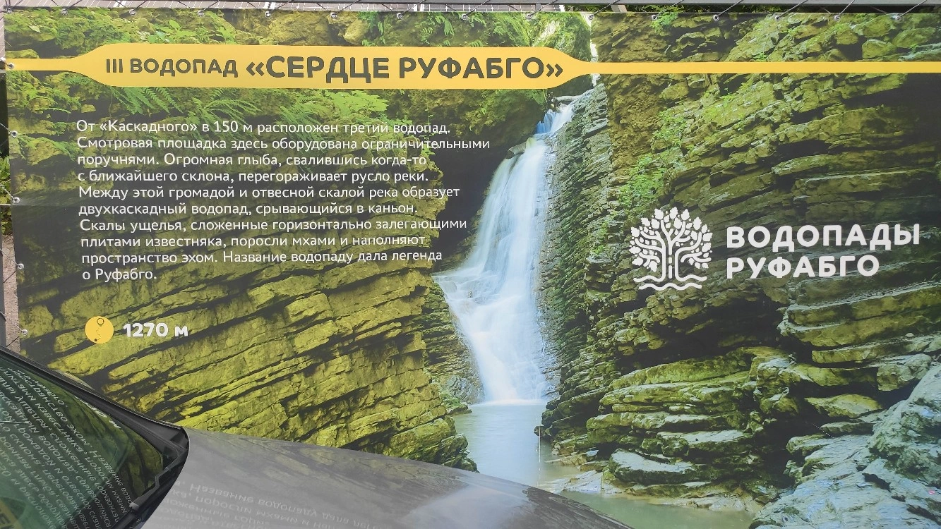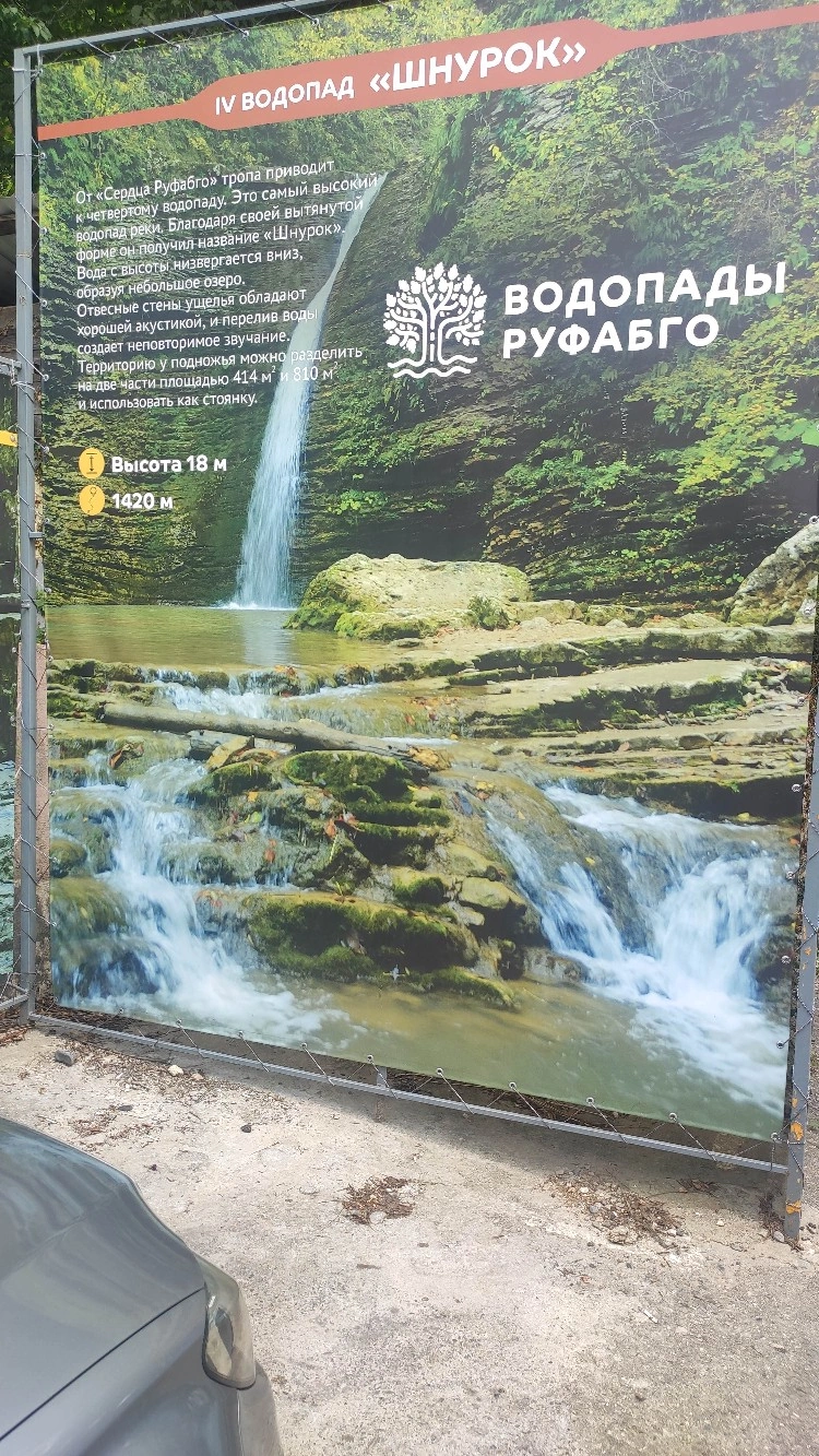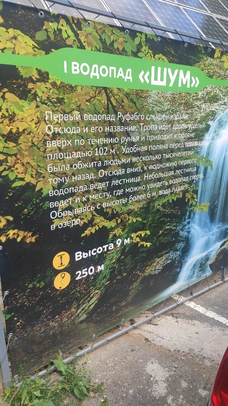 Водопад "Шум" (первый на тропе, и, наш с супругом субъективный взгляд,самый красивый. Знали бы заранее, точно бы дальше не пошли) находится в 250 м от начала маршрута. Водопад "Каскадный" - в 1150 м, водопад "Сердце Руфабго" - 1270 м, и водопад "Шнурок" - в 1420 м от начала пешеходного маршрута.