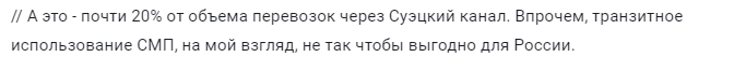 // А это - почти 20% от объема перевозок через Суэцкий канал. Впрочем, транзитное использование СМП, на мой взгляд, не так чтобы выгодно для России.