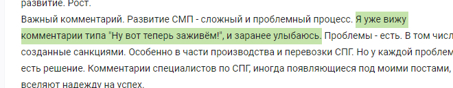 Важный комментарий. Развитие СМП - сложный и проблемный процесс. Я уже вижу комментарии типа "Ну вот теперь заживём!", и заранее улыбаюсь. Проблемы - есть. В том числе, созданные санкциями. Особенно в части производства и перевозки СПГ. Но у каждой проблемы есть решение. Комментарии специалистов по СПГ, иногда появляющиеся под моими постами, вселяют надежду на успех.