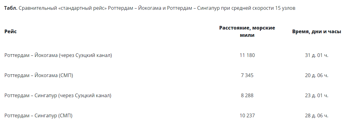 Путь из главного порта Европы (Роттердам) в Йокогаму также значительно короче. 7300 морских миль по СМП против 11200 морских миль через Суэцкий канал.