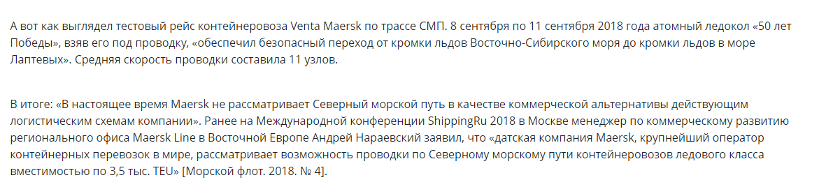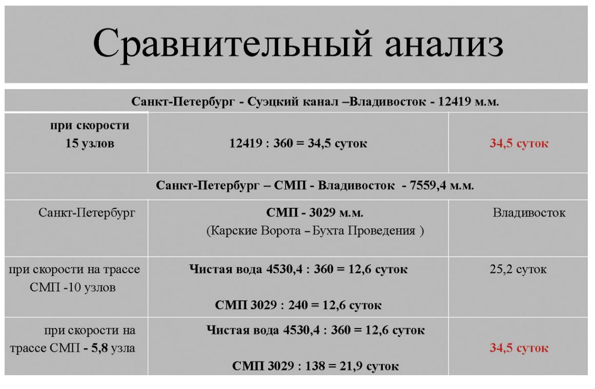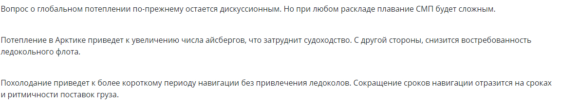 2. Скорость поставок. Когда ледокольный флот достигнет проектного количества судов, а проводка по СМП станет круглогодичной, скорость прохождения грузов увеличится в 1,5 - 2 раза. А время - деньги.