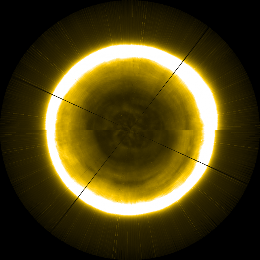 Окружающий солнечный диск характерный яркий ореол — его атмосфера. В центре воссозданного изображения можно увидеть темное пятно. Это корональная дыра. Она является источником высокоскоростного солнечного ветра. По мнению ученых, переплетение образующих корональную дыру характерных темных и светлых структур влияет на скорость испускаемых ей частиц. На изображении также можно выделить характерное утолщение в верхней правой части солнечного ореола. Оно связано с другой корональной дырой, наблюдавшейся в более низких широтах нашей звезды.