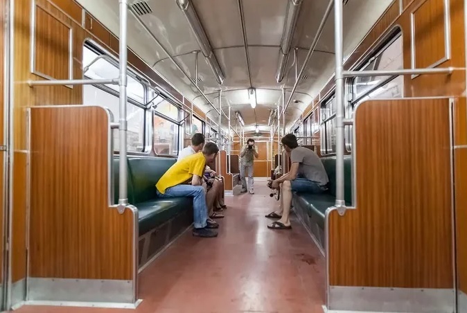 На видео не показали полностью салон вагона, только снаружи мельком, но можно заметить полумрак. Потому что лампы освещения работают только возле портретов вождей и над дверями. Э - экономия.)