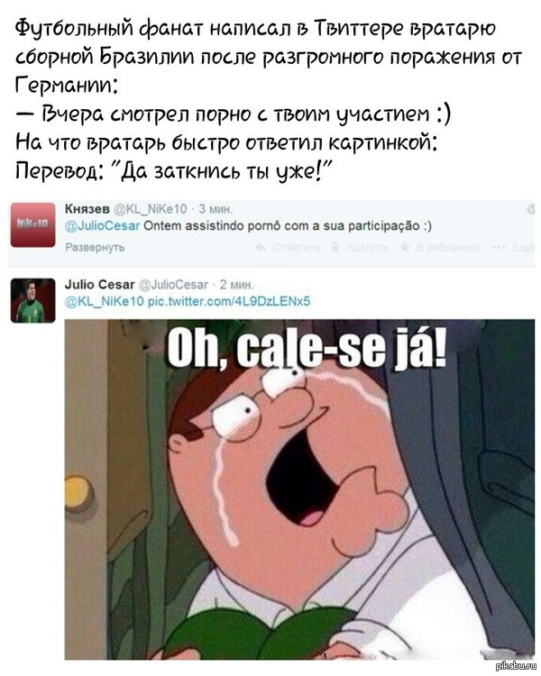 3306 MadMathers9 Сезару надоело) 11 лет назад Бразильский болельщик написал вратарю сборной бразилий в твиттере:Вчера смотрел по*но твойм участием.На что бразильский вратарь ответил:Да заткнись ты уже! Бразилия Германия X (Twitter) Чм 2014