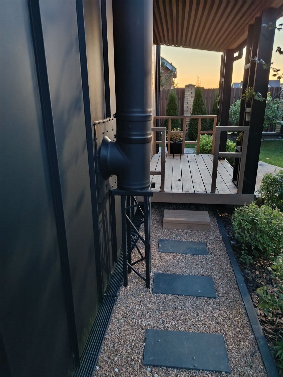Вот так это выглядит снаружи. Так как дымоход тяжелый сделал подставку.