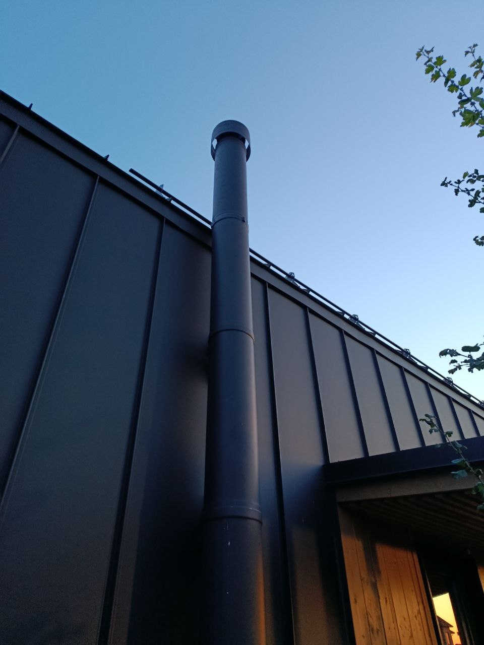 Хорошо получилось и не мешает проходу. Дымоход сэндвич. Высота почти 5 метров.