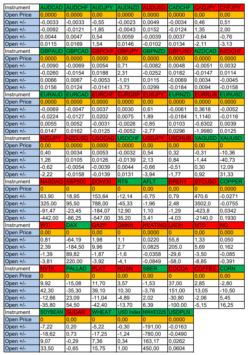 Весь перечень анализируемых активов указан ниже в общем количестве 62 инструмента. Здесь Вы найдете активы рынка Форекс, популярные активы Московской биржи, не менее популярные активы Чикагской биржи СМЕ и мажор криптовалютного сегмента - Биткоин, за которым следуют все альткоины.
