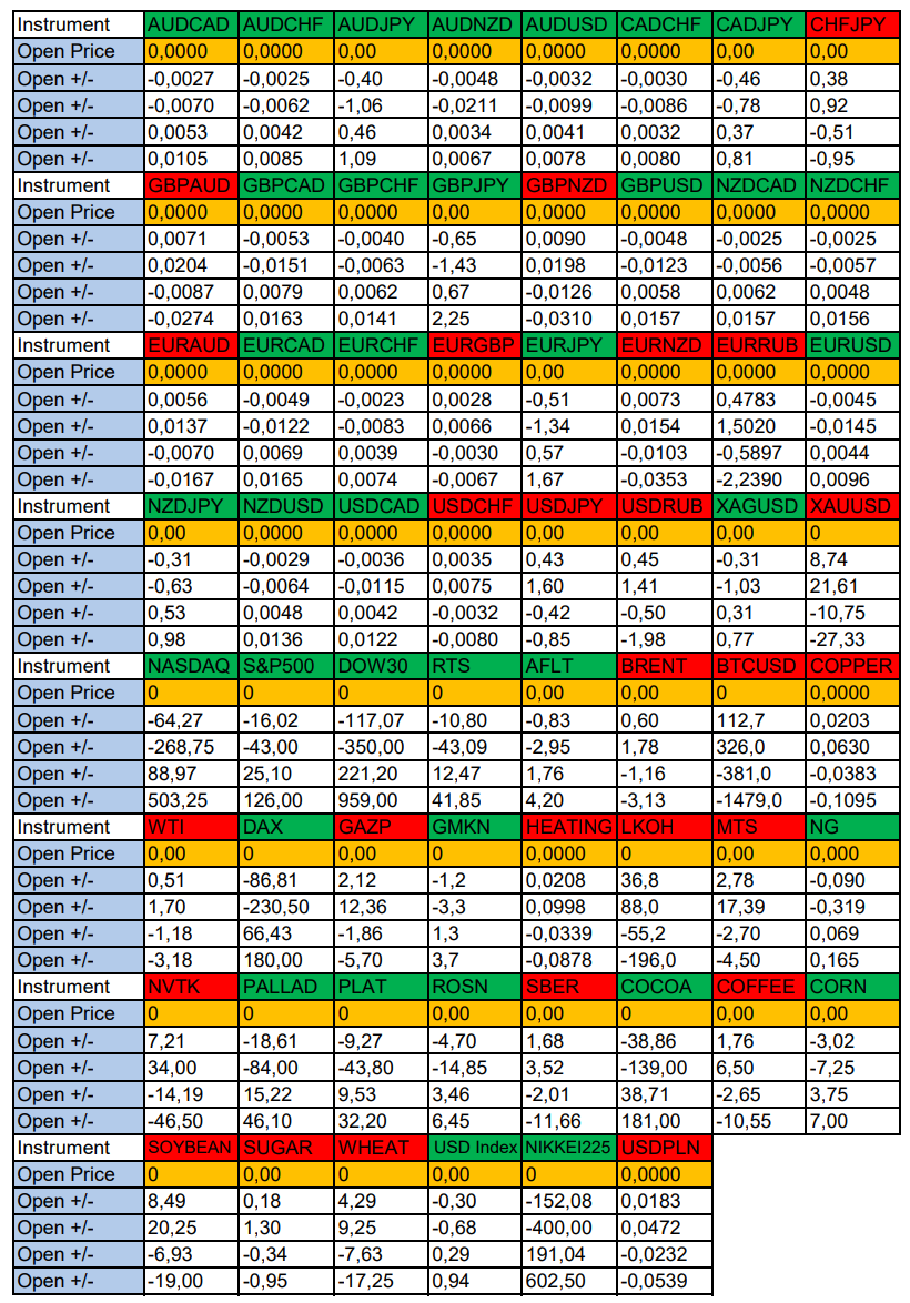 Весь перечень анализируемых активов указан ниже в общем количестве 62 инструмента. Здесь Вы найдете активы рынка Форекс, популярные активы Московской биржи, не менее популярные активы Чикагской биржи СМЕ и мажор криптовалютного сегмента - Биткоин, за которым следуют все альткоины.
