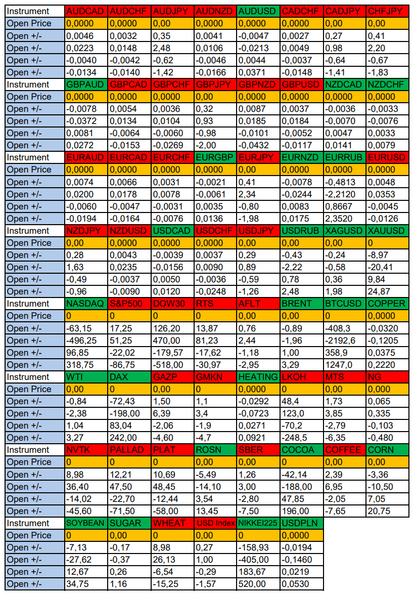 Весь перечень анализируемых активов указан ниже в общем количестве 62 инструмента. Здесь Вы найдете активы рынка Форекс, популярные активы Московской биржи, не менее популярные активы Чикагской биржи СМЕ и мажор криптовалютного сегмента - Биткоин, за которым следуют все альткоины.