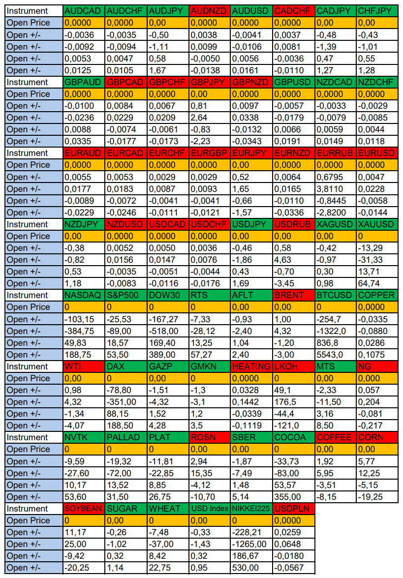 Весь перечень анализируемых активов указан ниже в общем количестве 62 инструмента. Здесь Вы найдете активы рынка Форекс, популярные активы Московской биржи, не менее популярные активы Чикагской биржи СМЕ и мажор криптовалютного сегмента - Биткоин, за которым следуют все альткоины.