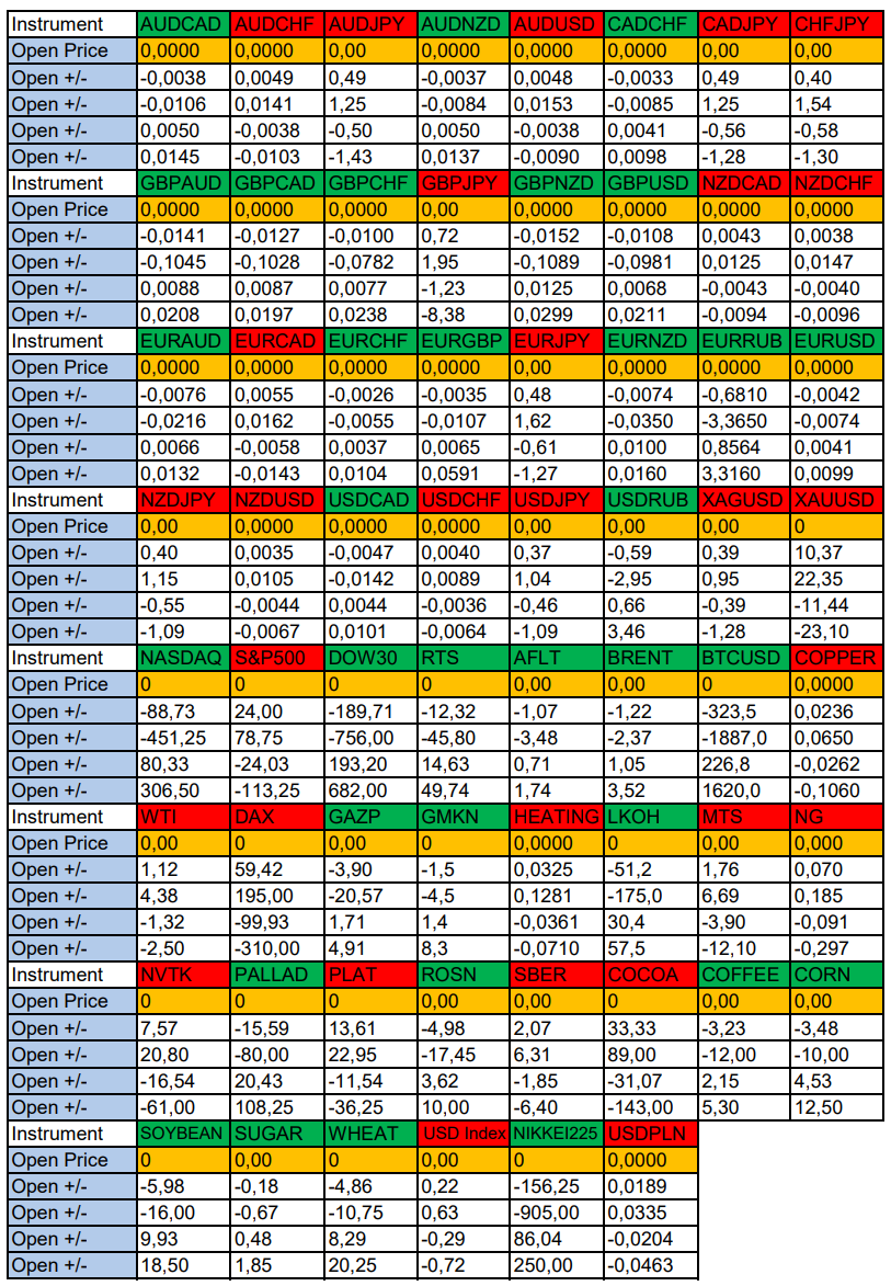 Весь перечень анализируемых активов указан ниже в общем количестве 62 инструмента. Здесь Вы найдете активы рынка Форекс, популярные активы Московской биржи, не менее популярные активы Чикагской биржи СМЕ и мажор криптовалютного сегмента - Биткоин, за которым следуют все альткоины.