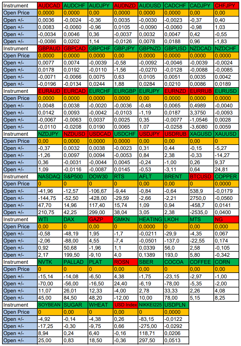 Весь перечень анализируемых активов указан ниже в общем количестве 62 инструмента. Здесь Вы найдете активы рынка Форекс, популярные активы Московской биржи, не менее популярные активы Чикагской биржи СМЕ и мажор криптовалютного сегмента - Биткоин, за которым следуют все альткоины.