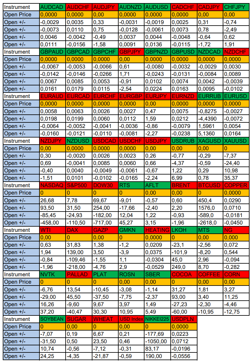 Весь перечень анализируемых активов указан ниже в общем количестве 62 инструмента. Здесь Вы найдете активы рынка Форекс, популярные активы Московской биржи, не менее популярные активы Чикагской биржи СМЕ и мажор криптовалютного сегмента - Биткоин, за которым следуют все альткоины.