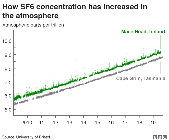 BBC отмечает, что дешевый и негорючий синтетический газ без цвета и запаха SF6 является чрезвычайно эффективным изоляционным материалом для электрических установок. Гексафторид серы широко используется в электроэнергетике: от крупных электростанций до ветровых турбин, электроподстанций в городах и поселках, предотвращая аварии и пожары. Однако SF6 обладает наибольшей опасностью для климатических изменений, связанных с глобальным потеплением. По своему эффекту его воздействие в 23,5 тыс. раз больше, чем у аналогичного объема выбросов углекислого газа.
