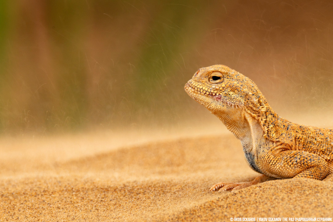Идея была в том, чтобы получить фотографию на длинной выдержке, так как был ветер и летел песок. Получилось бы, что сфинкс (а мне в профиль эта ящерица почему-то именно его и напомнила) лежит недвижимый среди кружащихся вокруг него песчинок времени.