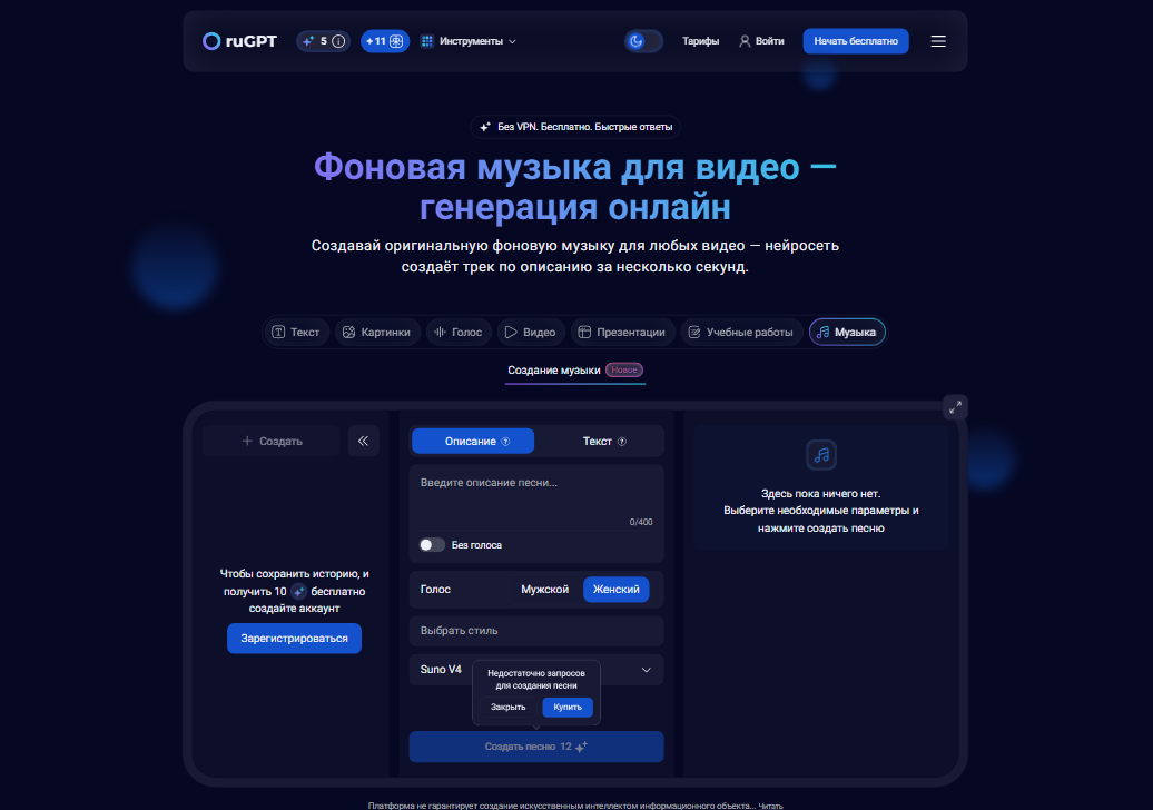 ruGPT io — это агрегатор нейросетей нового поколения, объединяющий десятки моделей в одном месте и позволяющий создавать фоновую музыку для видео онлайн всего за несколько секунд. Сервис работает прямо в браузере, без VPN и сложной регистрации: достаточно описать настроение, стиль и темп, и нейросеть сформирует оригинальный трек, который можно использовать в монтаже, рекламе, блогах, презентациях или видеоконтенте. Музыка генерируется с нуля, не нарушает авторских прав и идеально подходит для YouTube, коммерческих роликов, TikTok, сторис и других форматов. Подходит даже новичкам — система автоматически подбирает инструментал, ритм и гармонию, а вы просто слушаете результат и скачиваете.