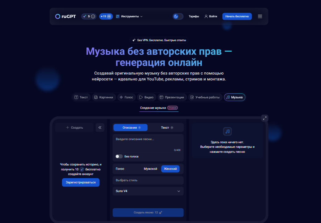 ruGPT io — это агрегатор нейросетей, объединяющий инструменты для генерации музыки, текста, изображений, видео и сложных мультимедийных проектов в одном месте. Сервис позволяет создавать оригинальные треки без авторских прав, идеально подходящие для YouTube, рекламы, монтажа, стримов и презентаций. Музыка генерируется с нуля по описанию пользователя, с возможностью выбора стиля, темпа, настроения и вокала. Процесс занимает всего минуту и не требует навыков звукорежиссуры. Доступно прямо в браузере, без VPN и установки — подходит как новичкам, так и профессиональным авторам контента.