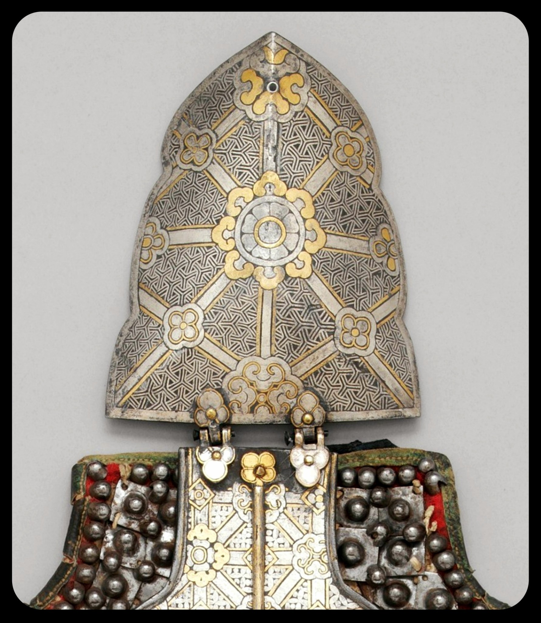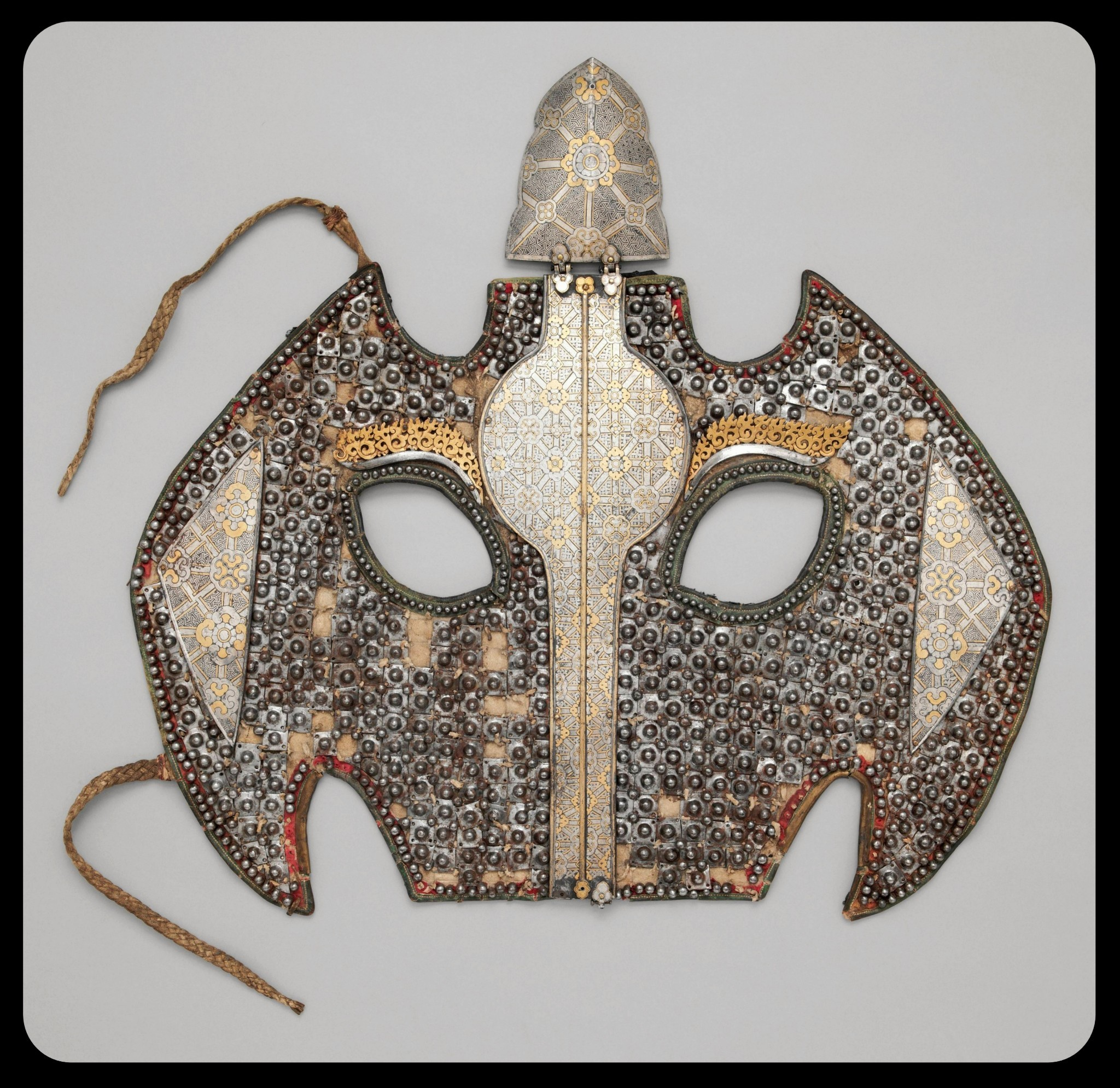 Этот тип доспехов известен как шаффрон, шафран (или шамфрон), и он должен был закрывать морду лошади от лба до кончика носа. Именно этот изготавлен путем пришивания небольших железных пластин, золотых и серебряных элементов и меди к кожаной/хлопковой основе.