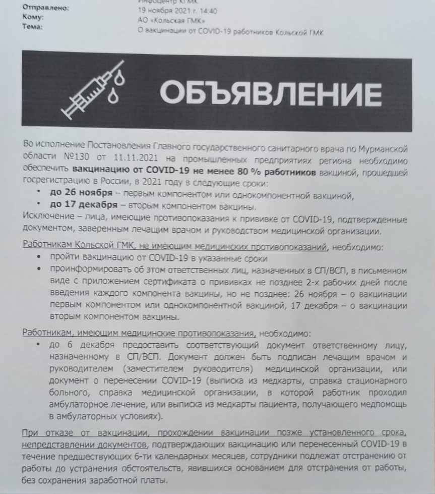 Постановление от 11.11.2021,приказ по компании от 19.11.2021,отстранение от работы, при непривитии первым компонентом до 26.11 2021 с 27.11.2021.Лядь, в компании вместе с подрядчиками и субподрядчиками и ВСП 12-15тыщь человек работников.Нахуя такой ажиотаж, в городе на сорок тысяч, где к профильному врачу можно записаться через два месяца, на время, и, просидеть 2.5 часа в очереди. И этот врач пошлёт в Мурманск, он больше ничего не умеет, их видимо учат в их Гиппократии этому-посылать в областной центр, причём всех, своих тоже посылают. Ну, а сейчас, толпа в 4000-4500 человек ломанётся в два прививочных пункта, и пандемия умрёт. Одномоментно и навсегда. Аминь