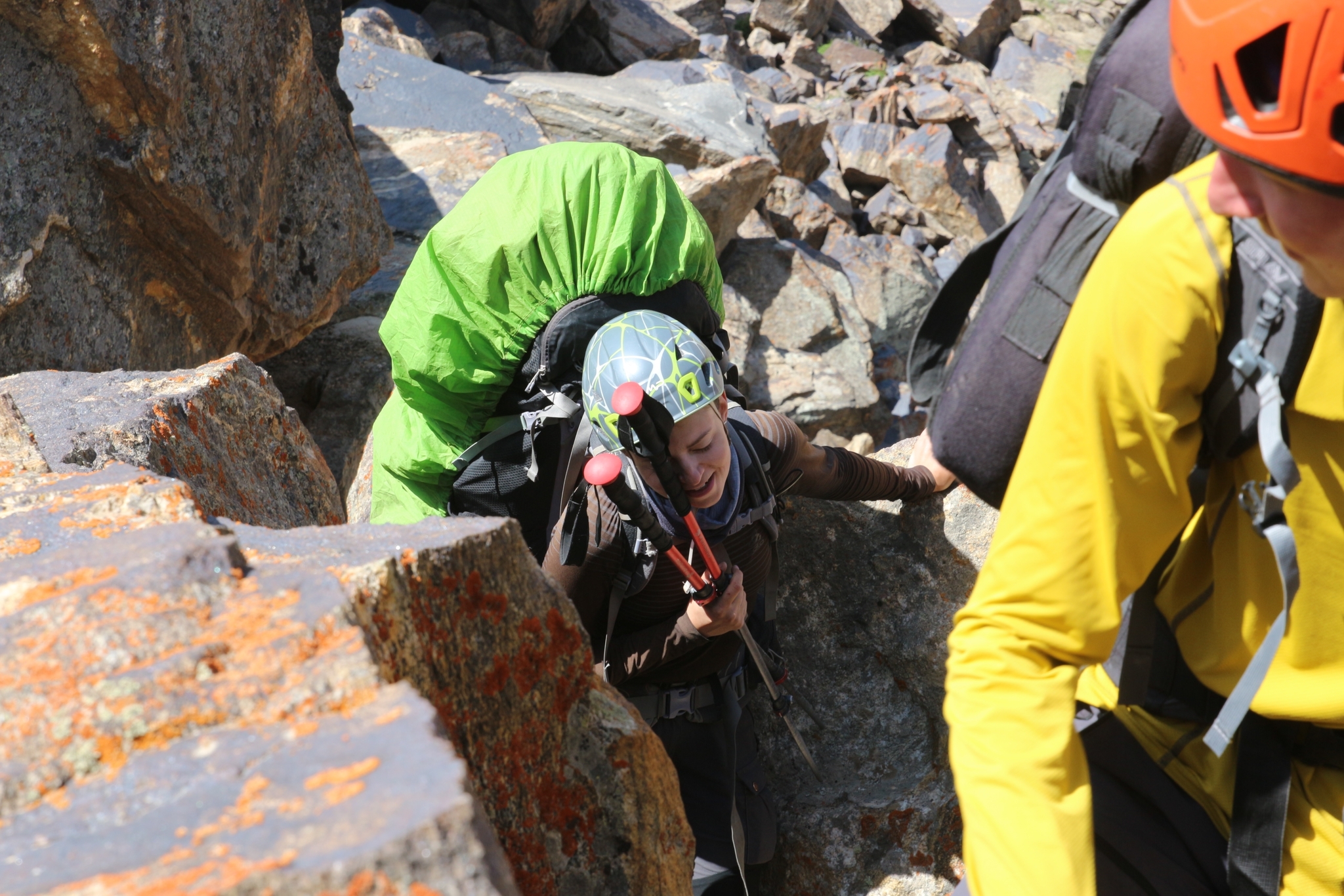 Пока мы залезали на эту вершину, то шли по скальным останцам, по которым было крайне удобно забираться на трех костях. А вот по осыпи идти без одной палки было не так удобно, поэтому я несколько перестраивал маршрут. За одну из ходок мы набрали вообще 140 метров - весьма лихо, учитывая темп нашей группы.