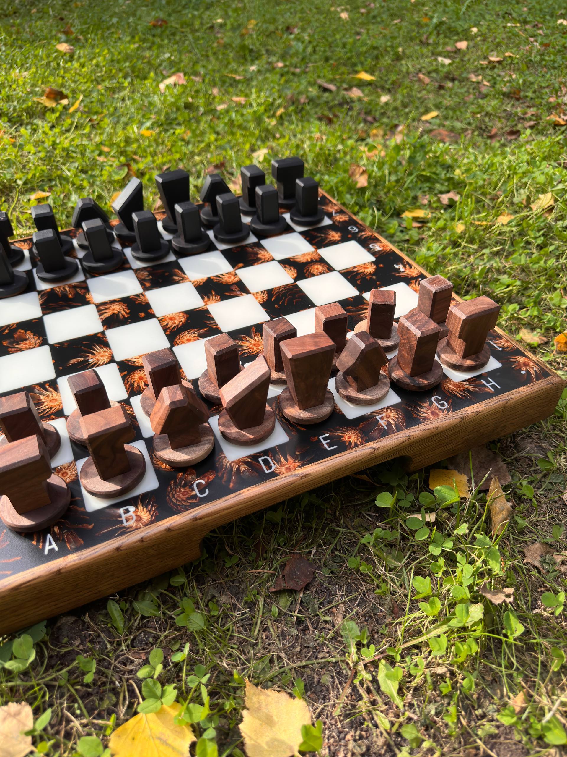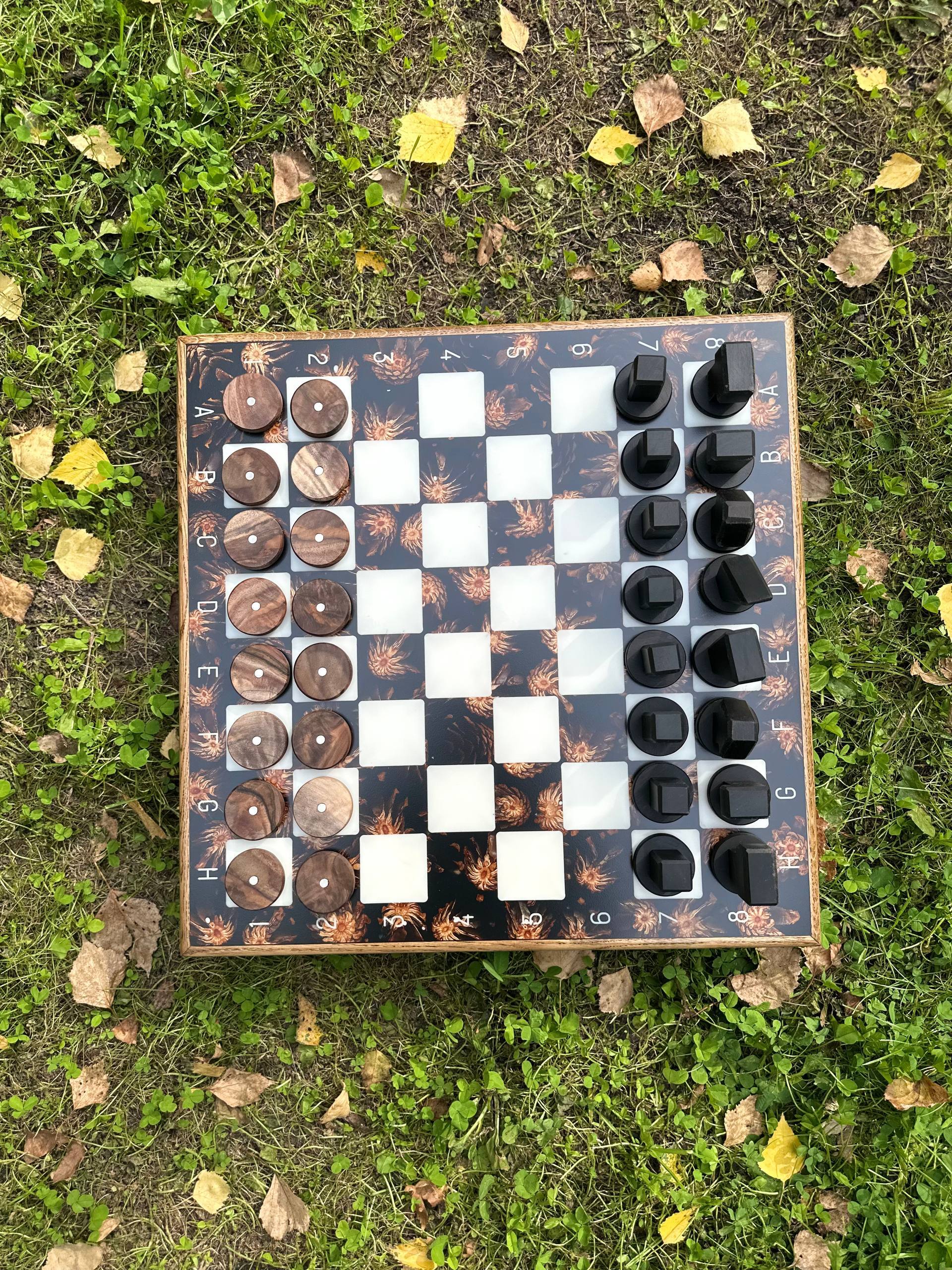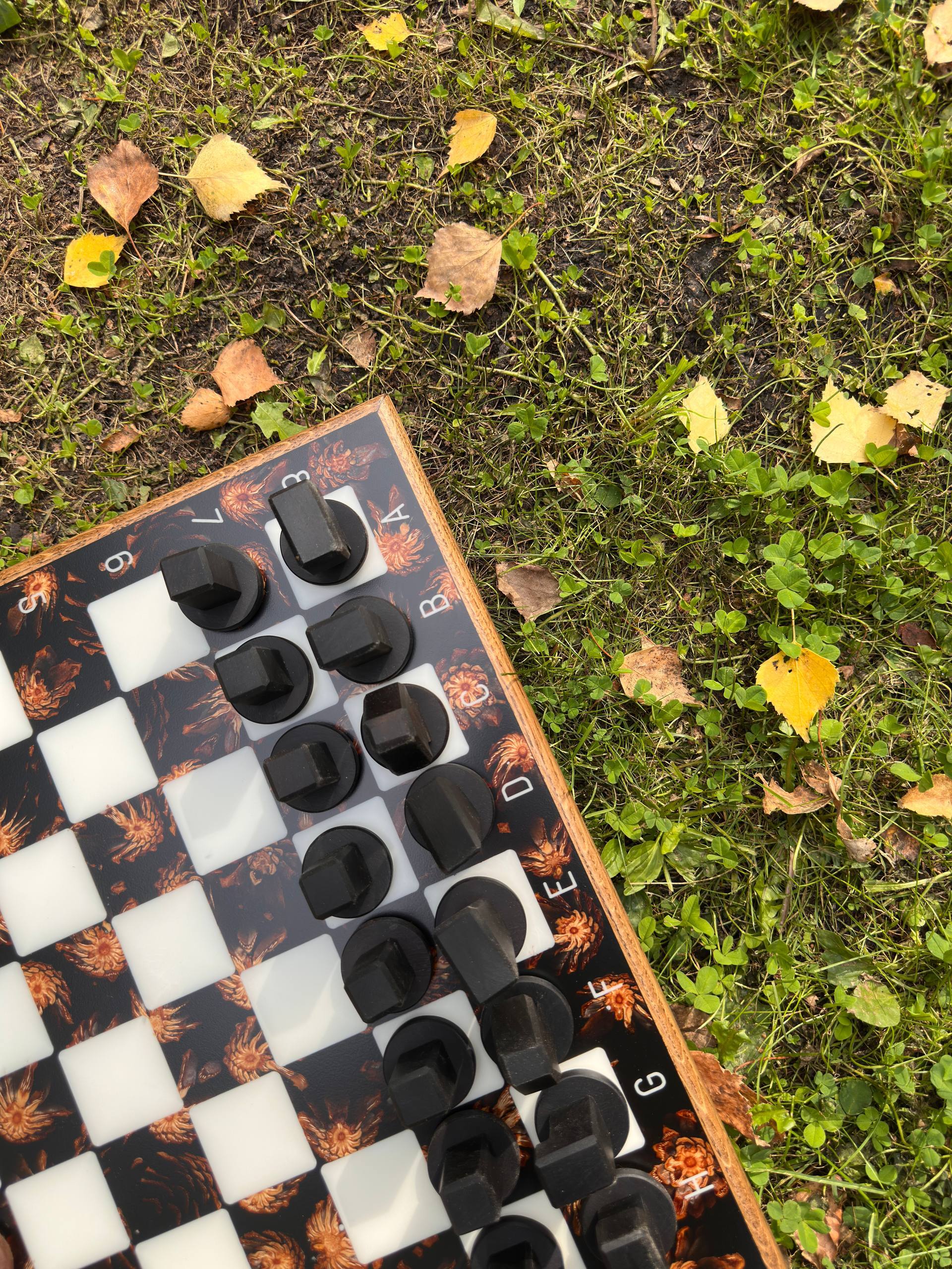 Фигуры на магнитах. Это позволило добавить шашки, не делая дополнительного комплекта фигур. Ну и красиво щёлкает когда фигурки ставишь.