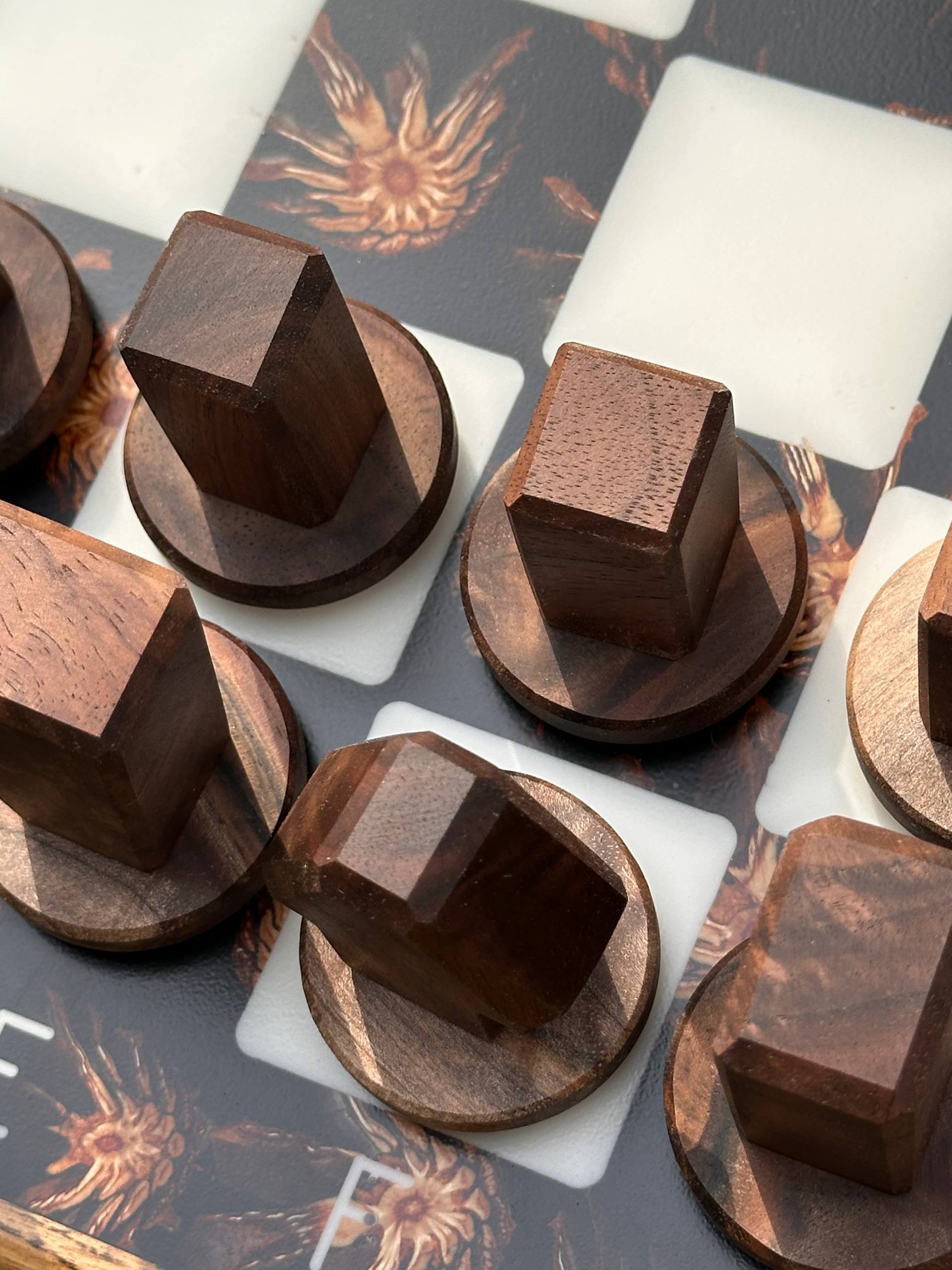 Фигуры сделанны из черного стабилизированного граба и корня манжурского ореха. Сперва хотел заказать готовый вариант, чтобы не выдумывать велосипед, но с двух попыток осилил. Хотя первое время мне они не нравились. Цилиндрической формой все же привычнее.