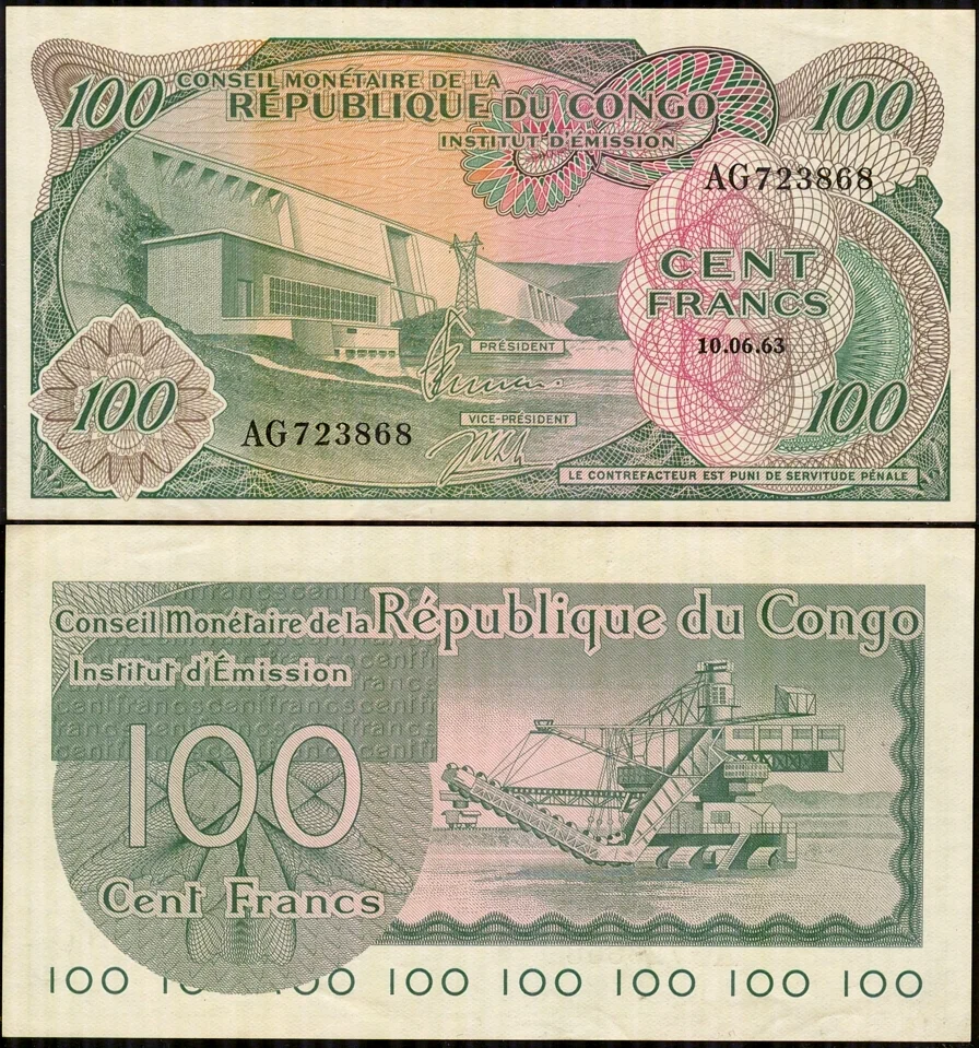 Республика Конго (на тот момент ещё не демократическая). 100 франков 1963 года. Многоковшовый шагающий экскаватор.