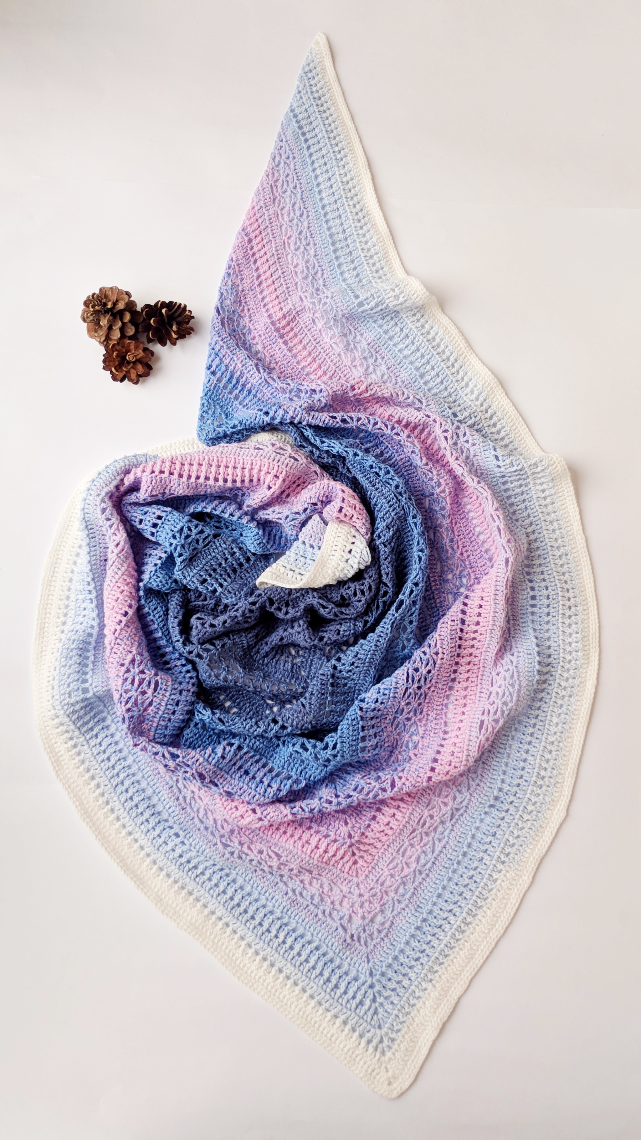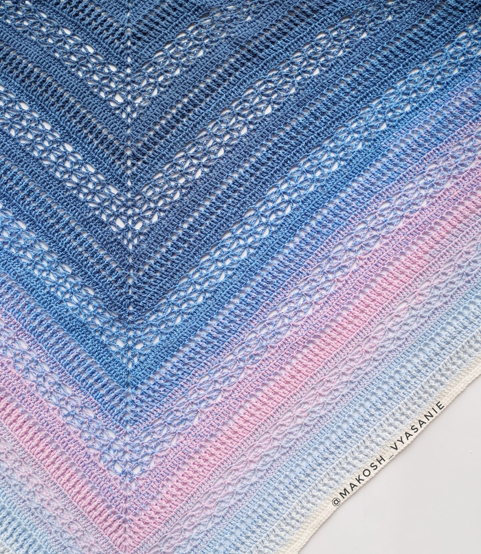 Пряжа YarnArt Rosegarden - 100% хлопок. Признана многими Мастерицами как капризная и тяжелая в работе) Но мне нравится, вяжу не первый платок из неё, проблем нет.