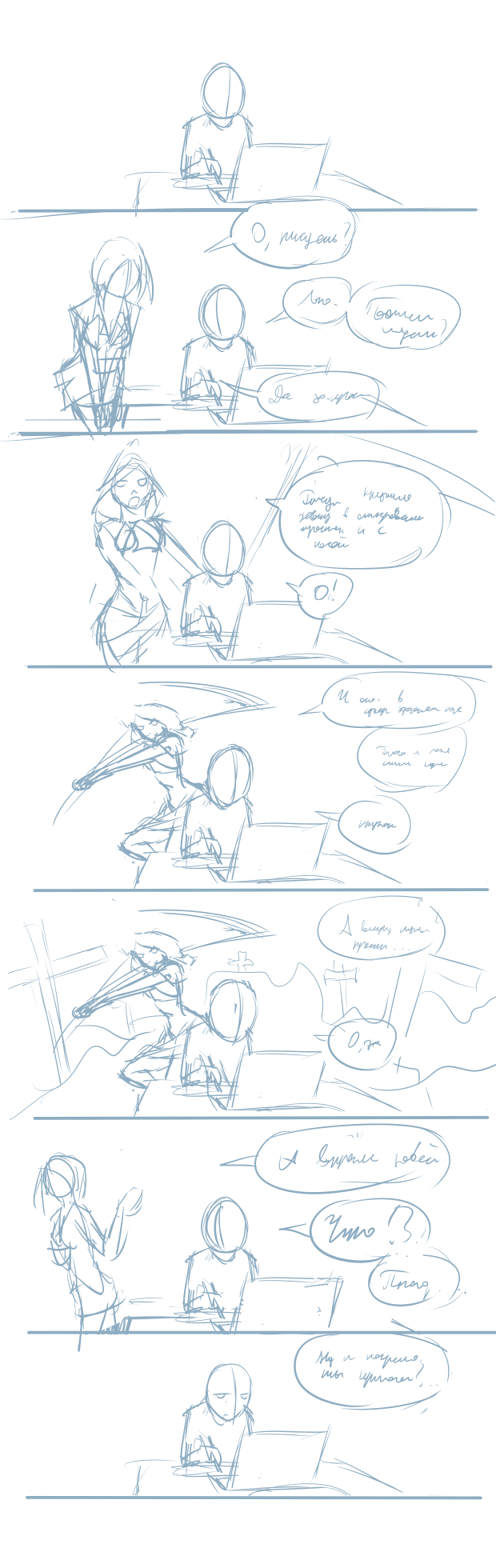 Рисую сразу на планшете, на бумаге уж и не помню когда последний раз рисовал. Начинаю вот с такого черновика. Так как комикс про музу простой, после этого рисую сразу чистовик, без всяких промежуточных черновиков в улучшенном качестве.