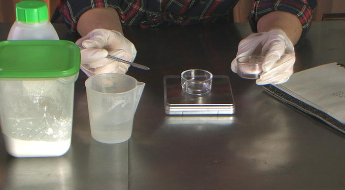 1) Отмерим всю воду по рецепту, нагреем ее в микроволновке градусов до 50, это позволит растворить ПАВ быстрее. Посолим (1% соли обычно достаточно), введём трегалозу и глицерин. Я взяла гималайскую соль, обычная ничем не хуже.
