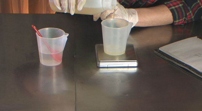 2) Добавим в стакан анионный ПАВ — изетионат натрия, полностью растворим, помешивая. Пахнет он классно, кокосом. Мешать аккуратно, если набъете пены, оседать она потом будет очень долго. После полного растворения изетионата вводим Децил глюкозид.