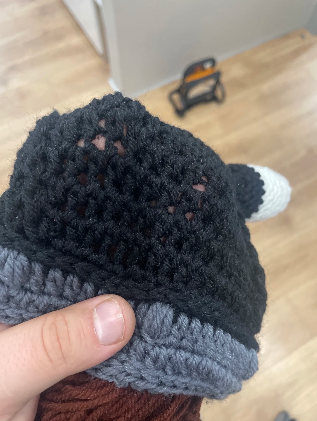 Борода оказалось тяжелой и мне пришлось дополнительно усиливать нащечники, на это у меня уже не оставалось серых ниток, поэтому пришлось докупать моток, который использовался только на 10%. Заплетаю косички, что бы открыть рот и вуа-ля: