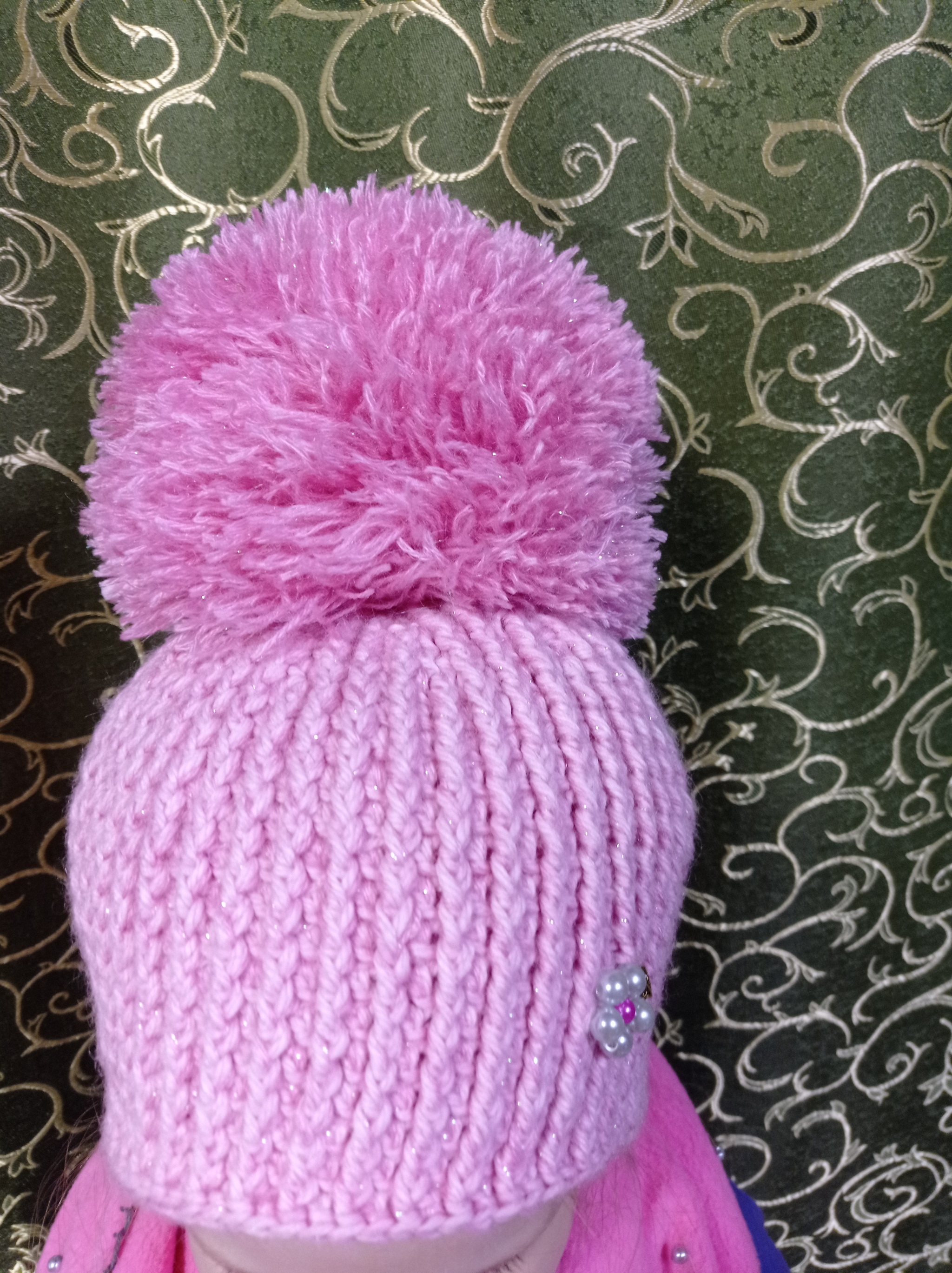 Помпон получился не только большим, но и увесистым. В результате шапка сваливалась с головы дочери. Пришлось сделать противовес в виде широких завязок.
