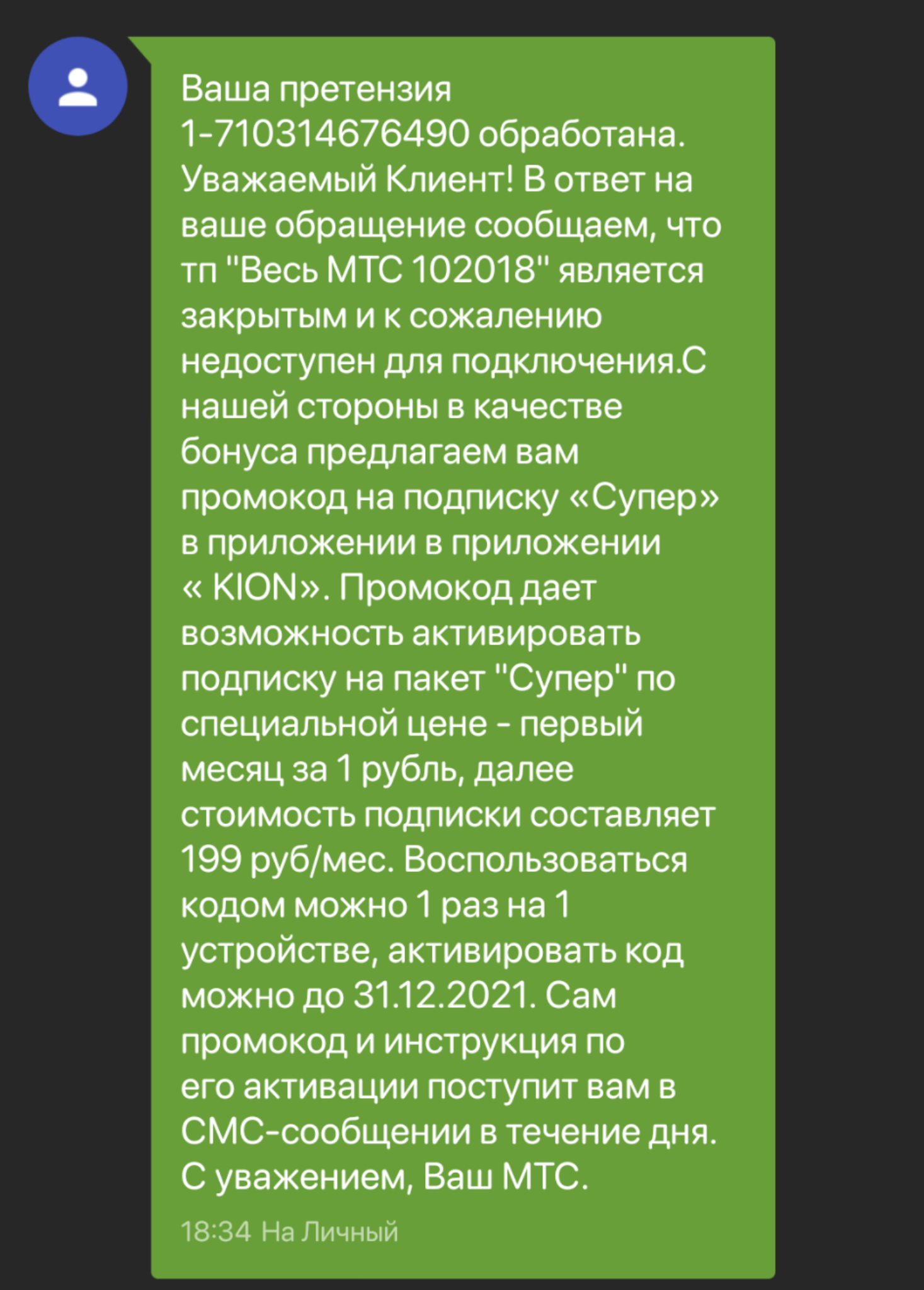 Пишу обращение ВК, на сайте МТС, жду 4 дня и в ответ получаю вот такое сообщение: