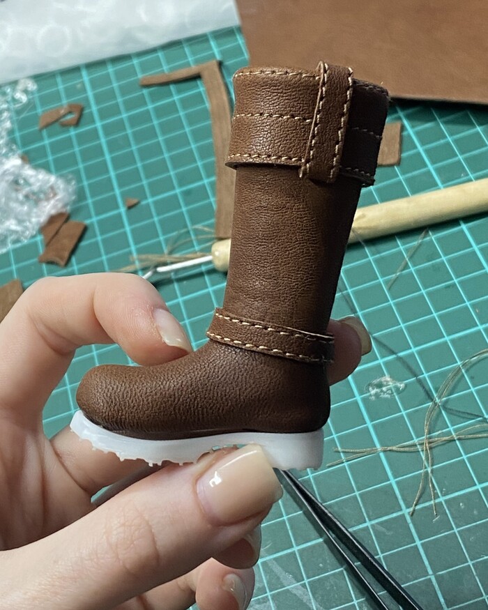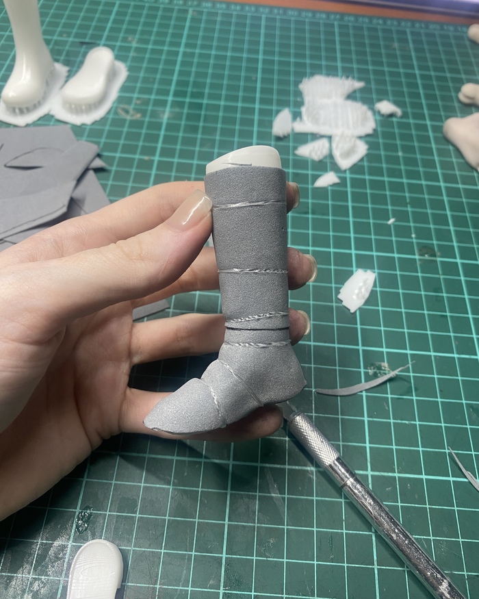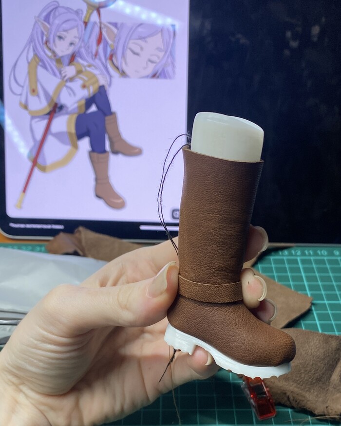 Дальше у нас идут сапоги. Вот с этого процесса я прям кайфанула. Сделала в 3д колодки и подошву, распечатала, сняла выкройки. Немного расстроилась, что сделала протектор недостаточной высоты и он будто стерся. А потом задумалась, сколько лет Фрирен таскает эти сапоги и решила, что так даже лучше)