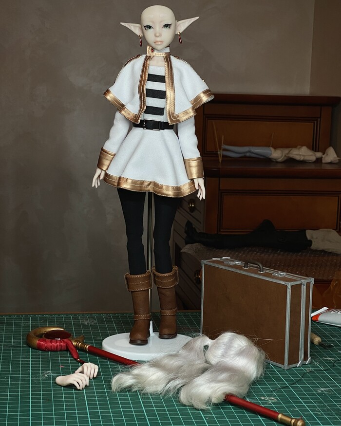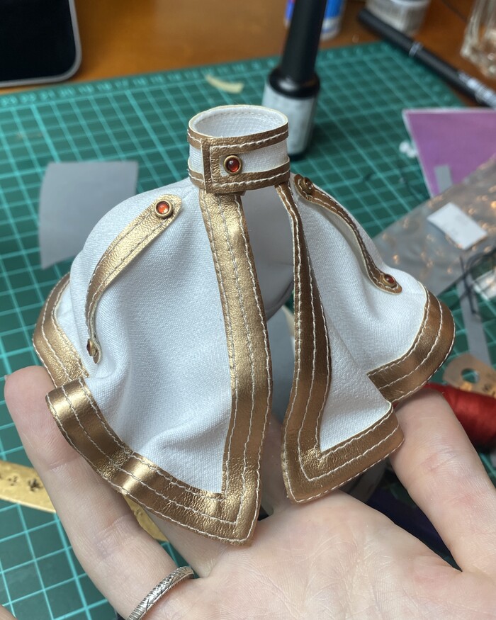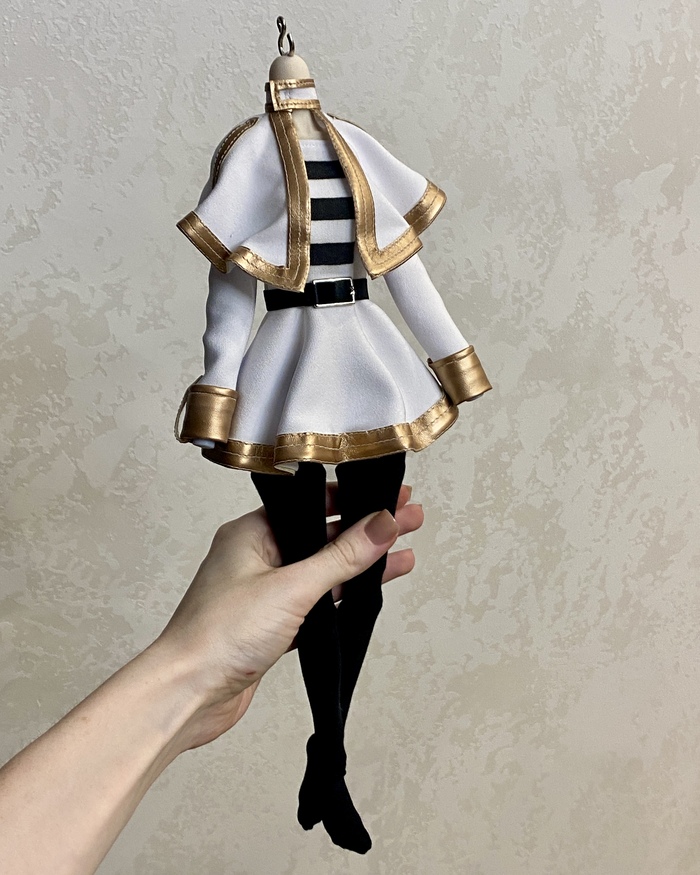 Выкройки редактировать все равно пришлось, где-то раза с третьего результат меня устроил. Юбка правда коротковата, но спишем это на стилизацию. А вот золотой край неожиданно оказался проблемой. Каждый день я ехала и покупала золотые ткани/бейки/ленты, потом пробовала их пришить, получалось отвратительно и операция повторялась. С полноразмерным костюмом было бы проще, но в миниатюре все то слишком толстое, то ложится уродливыми складками, то просто выглядит дерьмово. Жалко, что не подумала сфоткать неудачные варианты. На седьмой день я, уже не веря в успех, попробовала кожзам и ДА, это было оно. Под него еще вшила проволоку, чтобы можно было самостоятельно формировать складки.