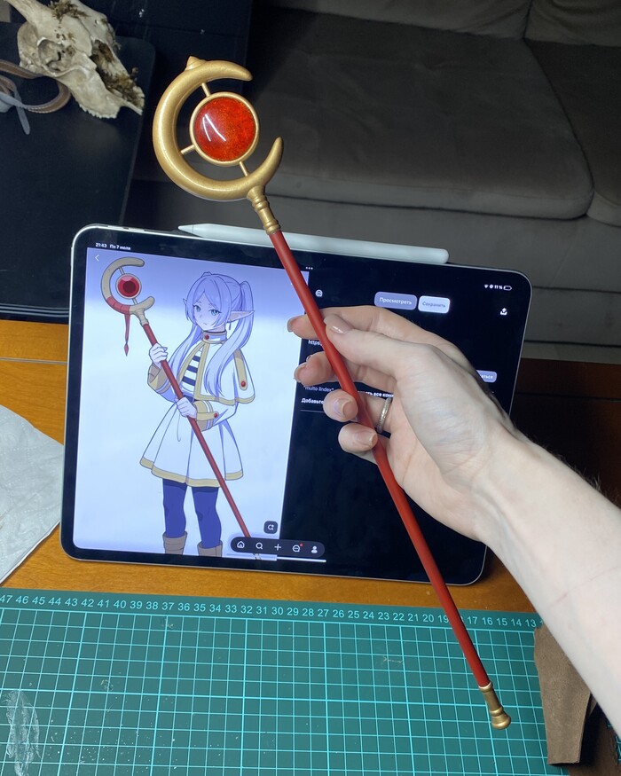 Посох сразу вышел потрясно, но я не учла момент, что в местах склейки надо делать ключи (выпуклость и впуклость), поэтому он у меня упал и развалился. Пришлось сверлить и вставлять металлические штифты. Зато теперь места склейки прочнее любых других мест.