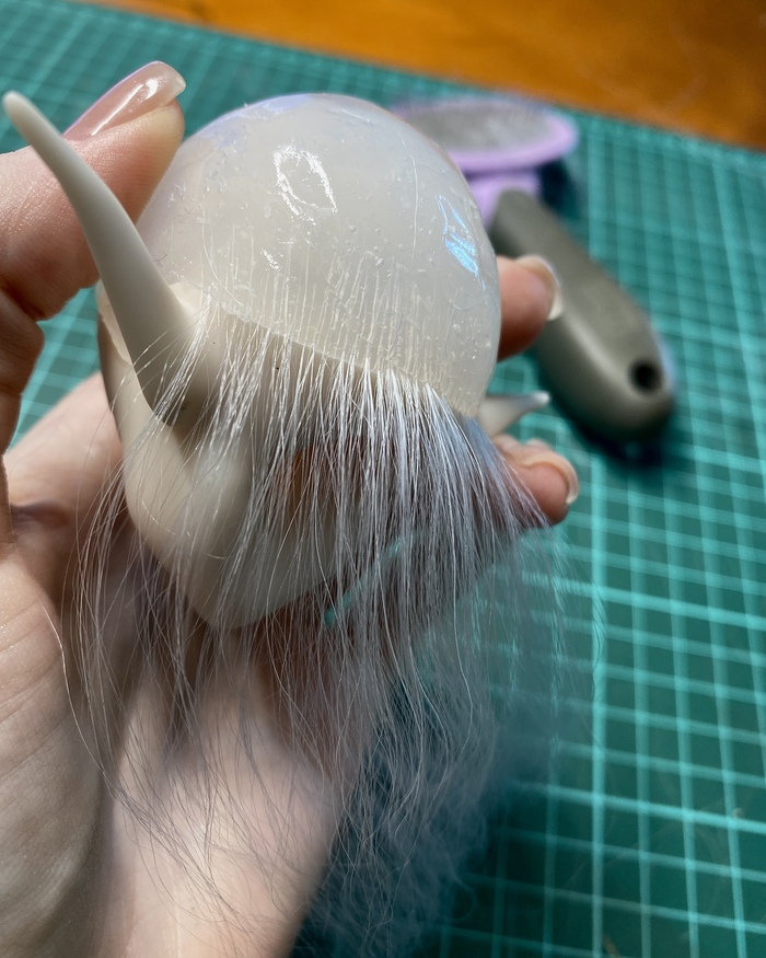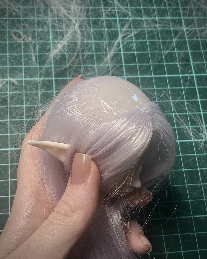 Изначально хотела сделать ей два образа, поэтому подумала, что было бы здорово, если бы можно было менять кукле прически. Обычный парик не дает такой возможности, так что я решила пойти на авантюру и попробовать сделать вживление волос. Можно ли было просто сделать два парика? Да. Но если уж заморачиваться, то со всей силы.