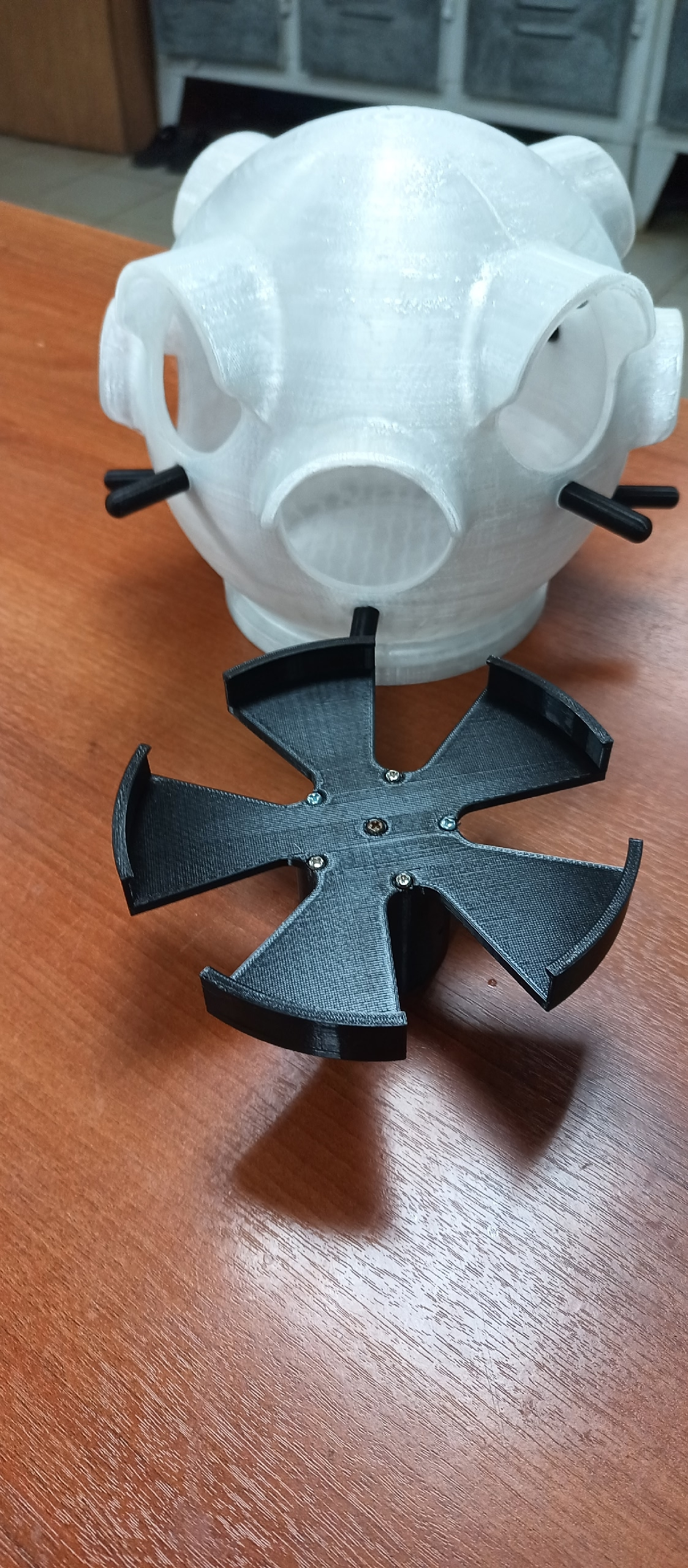 Шар диаметром 200 мм, основание 150мм. Долго думал, как её подвесить. Печаталось 10 часов при 5% заполнении без поддержек из PETG. Немного напаутинил во внутренней, верхней части шара, нужно было поднастроить мосты. Ушло около 300 граммов пластика.