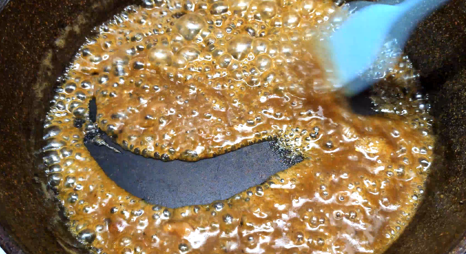 В получившийся соус возвращаем шашлыки и продолжаем обжаривать ещё минут 5-7. Поливаем в процессе жарки соусом.