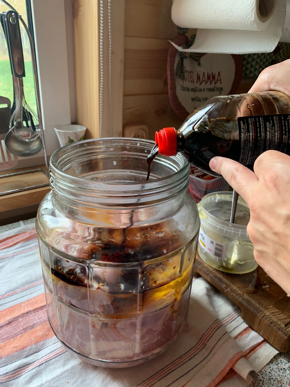 Закрываем крышкой от насекомых и ставим эту банку в прохладном месте на минимум 3 часа, а ещё лучше на 12 часов. Больше смысла не вижу, мясо впитает слишком много сладости.