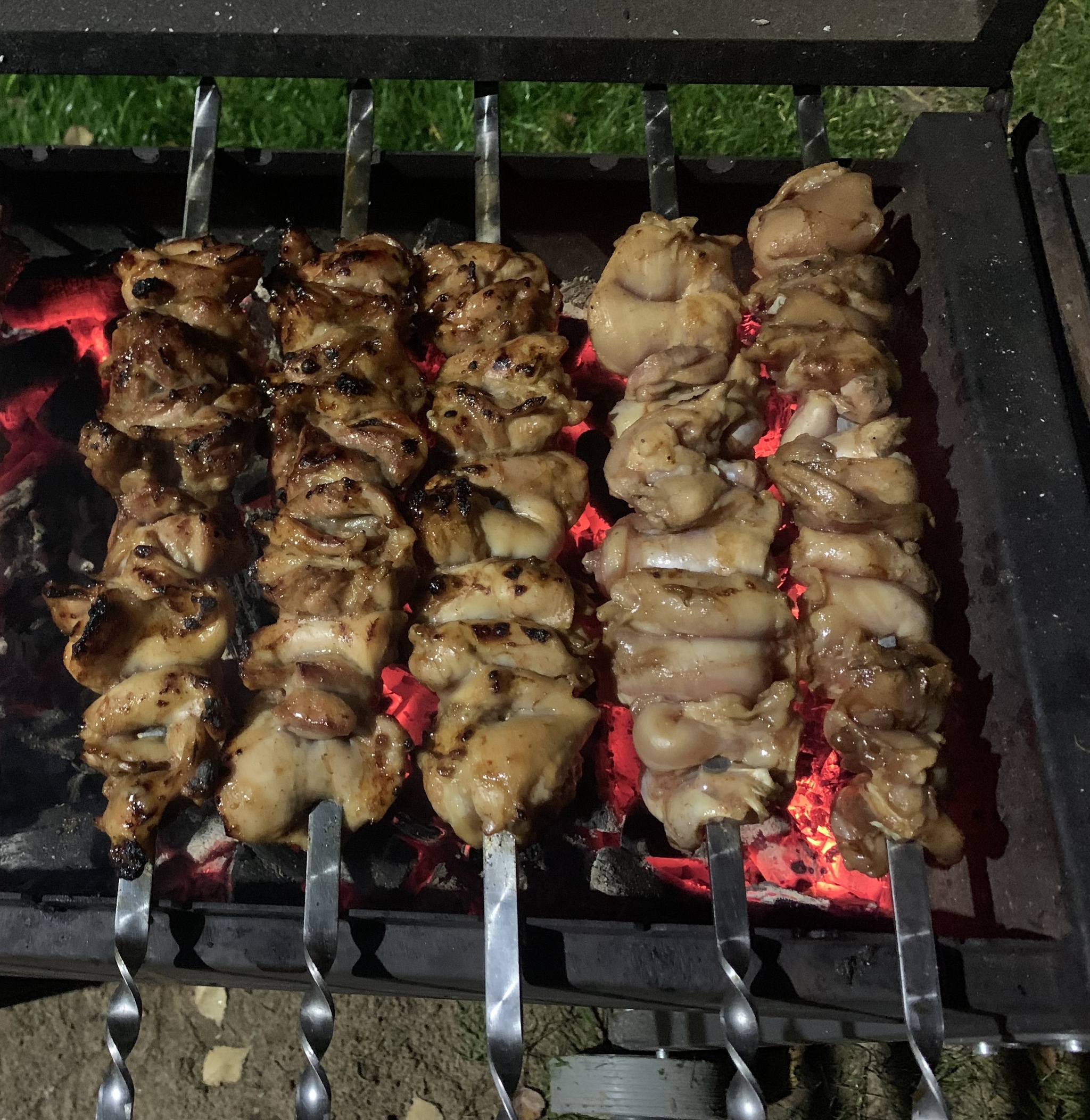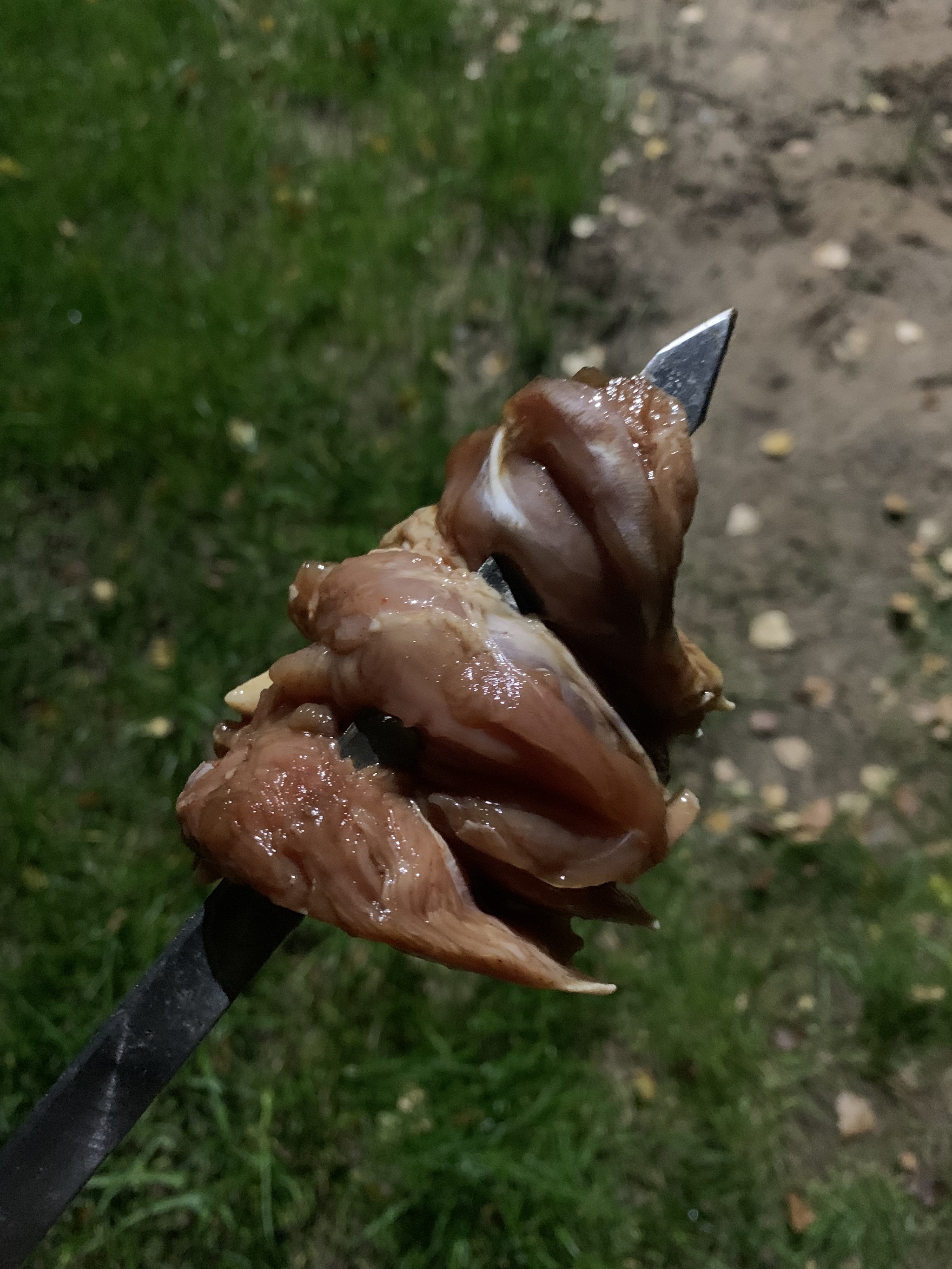 В этот момент начинаем насаживать курицу на шампуры. Многие жарят курицу на сетке, но потом ее адски сложно мыть, поэтому я люблю именно шампур, да и контролировать степень прожарки на них проще.