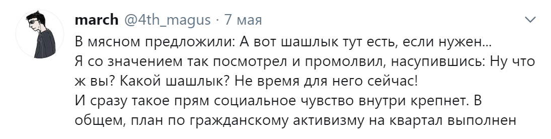 29 prof.Voland Шашлык vs совесть) 5 лет назад ...бля, пойду тушенку открою Мясо Шашлык Социальное Самоизоляция Коронавирус Хочу X (Twitter) Скриншот Мат Ещё 0