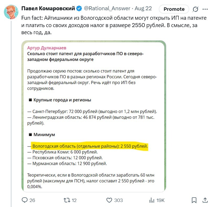 Мои соболезнования всем айтишникам из Вологды – налоговый лайфхак с патентом за 2550 рублей в год больше работать не будет…