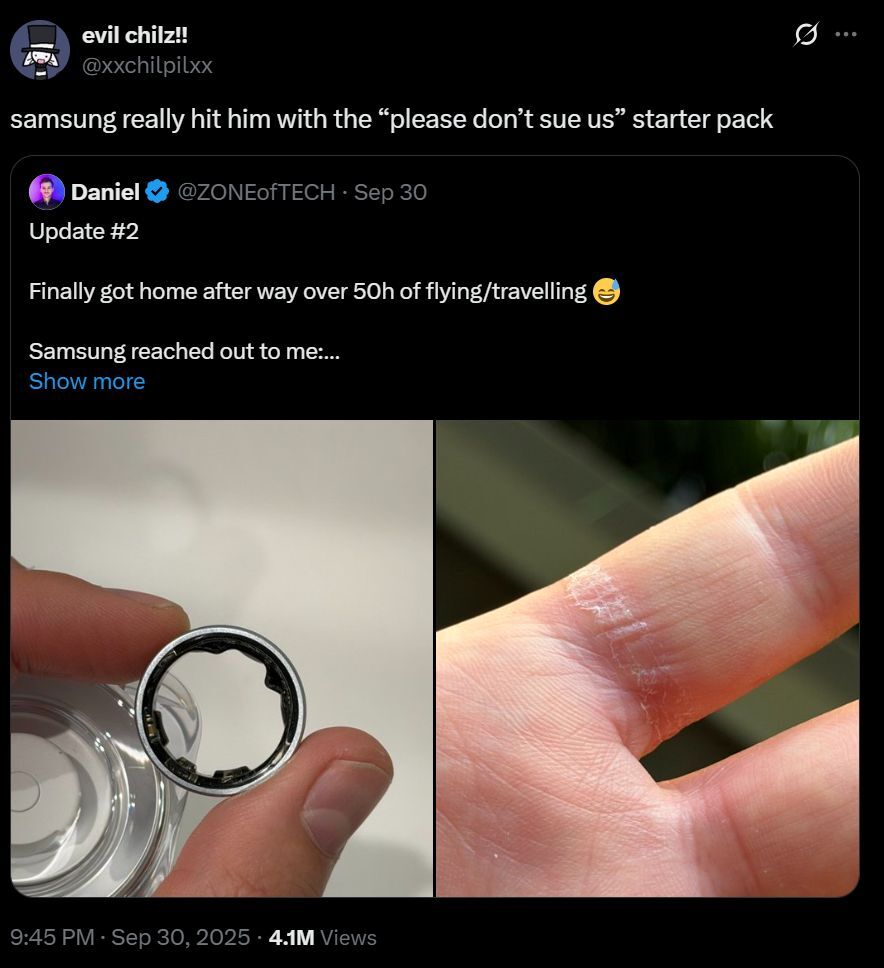🐌 У парня вздулась батарея смарт-кольца Samsung Galaxy Ring прямо в аэропорту – в итоге его не пустили на рейс, и ему пришлось срочно ехать в больницу, чтобы снять кольцо с пальца. Когда он написал об этом в Твиттере, Samsung оплатили ему билет до дома и забрали кольцо «для дальнейшего расследования». Со времен Galaxy Note 7 ничего не поменялось...